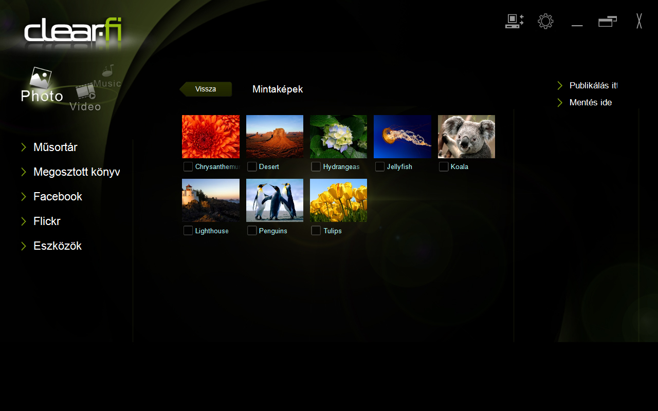 A clear.fi-vel már az androidos A500-ban is találkoztunk. Windows alatt kicsit más a „ruhája”, de funkciója nem változott természetesen; zenéinket, képeinket és videóinkat találjuk meg benne egy helyen összegyűjtve. Amivel több egy átlagos gyűjteménynél a dolog, az az, hogy szinkronizálni lehet a képeket a Facebook és Flickr adatlapunkkal is.
