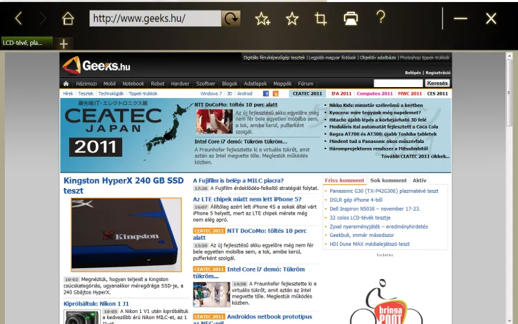 A címsor mellett tudjuk hozzáadni az adott oldalt a kedvencekhez, vagy megnyitni a korábban már elmentett linkeket. Ezen kívül innen nyomtathatunk is, vagy lehetőség van kivágni az oldalból egy részletet és azt elmenteni képként. Ami jó pont, az az, hogy használható a multitouch és a görgetés is rendeltetésszerűen, ami mondjuk a Google Chrome-ban és más böngészőkben nem mondható el. A multitouchos nagyítás viszont nagyon darabos, közel sincs meg a mobiloknál tapasztalt finom, fokozatos nagyítás, ami még a pozícionálást is megnehezíti.