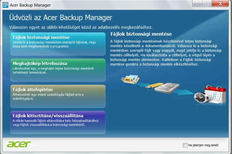 A gyártó saját adatmentő programot is mellékelt a tablethez, Acer Backup Manager néven. Magyar nyelvű felületen van lehetőségünk a teljes rendszerről, vagy csak egyes fájlokról biztonsági mentést készíteni, korábbi állapotot visszaállítani, vagy migrálni a rendszert egy másik meghajtóra.