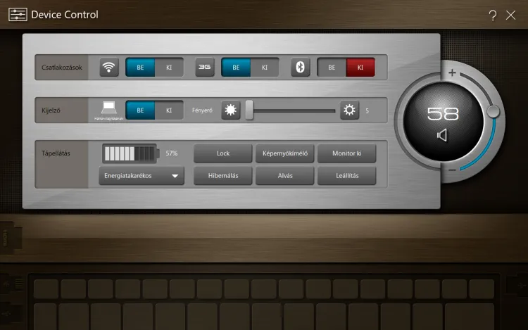 Végül, de nem utolsó sorban külön eszközkezelőt is kapunk, amely szintén tud magyarul. Felületét tekintve először érintőképernyő-barátnak tűnik, ez azonban nem igaz, inkább egérre szabott. A programból kényelmesen állíthatjuk a hálózati kapcsolatokat, a kijelző fényerejét, energiatakarékossági beállításokat és a hangerőt is.