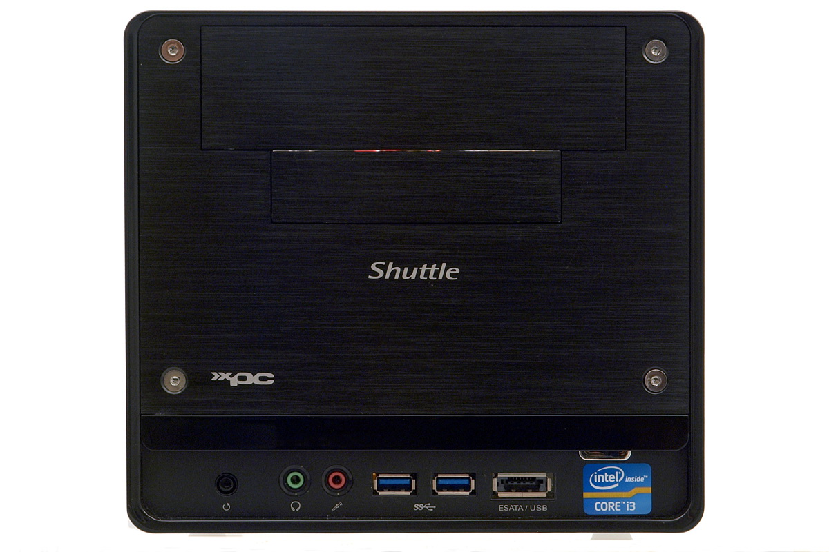 Egy barebone gép esetében igazából az előlap az, ami arculatot adhat, ezért létfontosságú, hogy a gép ezen része jól nézzen ki, és persze funkcionalitás szempontjából is jól teljesítsen. A Shuttle esetében szerintünk nincs ok panaszra, még annak ellenére sem, hogy az előlapi csatlakozókat a gyártó nem rejtette fedél alá, így a reset gomb, a hangcsatlakozók, a két USB port és az eSATA/USB kombó folyamatosan szem előtt vannak. A bekapcsoló gomb elhelyezkedése trükkös, ez ugyanis a csatlakozópanel belső-felső élére került, közvetlenül a fényes fekete díszítőcsík alá, így elsőre nem olyan könnyű megtalálni. Az előlapon jól látszik, hogy a gépben egy 5,25 illetve egy 3,5 colos meghajtónak biztosan van hely, előbbi kiváló lehet optikai meghajtó fogadására, utóbbiba pedig mi egy kártyaolvasó modult tennénk (persze ez nem kötelező).