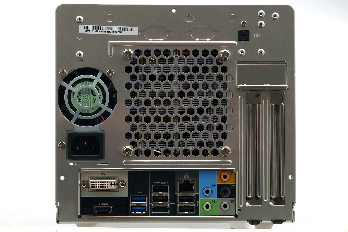 A gép hátsó részét a gyártó rendesen telepakolta, hiszen itt el kellett helyezni a szellőzőket, a bővítőkártyák nyílásait és az alaplapi csatlakozókat is. Kezdjük szépen sorban: bal oldalt a tápegység ventilátora, alatta pedig a tápcsatlakozó található. Tőle jobbra, középen a CPU hűtőjének nyílása, a másik szélen pedig a bővítőkártyák nyílása található (2 db) – ezek teljes magasságú kártyákhoz is jók és alapesetben természetesen egy fémlappal le vannak fedve. A csatlakozópanel DVI és HDMI videokimeneteket, két USB 3.0 és négy USB 2.0 portot, eSATA/USB csatlakozót, Ethernet portot és a szokásos analóg hangcsatlakozókat tartalmazza. Az audio panelt egy optikai kimenet egészíti ki, ami a gép hátoldalának jobb felső sarkában kapott helyett, távol a többi csatlakozótól. Érdekességképpen megemlítjük, hogy a szellőzők felett két további hely is rendelkezésre áll, ahova további USB csatlakozókat vagy esetleg soros portot tehetünk, ha ezekre szükségünk lenne.
