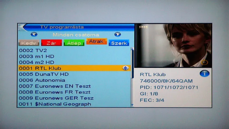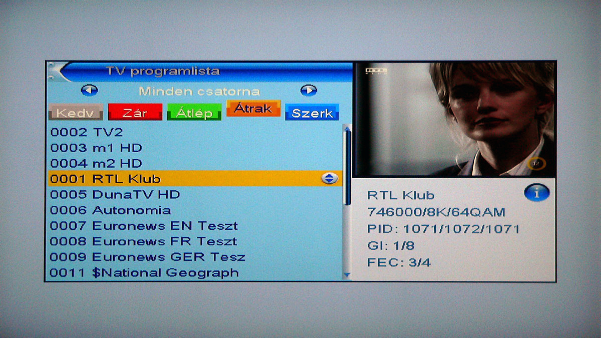 Csatornaváltásnál automatikusan felugrik az információs ablak, ami a csatorna fontosabb adatai mellett (név, felbontás, tömörítés, teletext és EPG) az aktuális és a következő műsor címét is tartalmazza. Időkukac nincs, vizuálisan így sajnos nem látjuk, hogy az aktuális játékidőből mennyi telt már el (óra természetesen van, tehát ez kiszámolható, de mégis kényelmesebb a grafikus szemléltetés). Ez a panel később természetesen az Info gomb megnyomásával bármikor elérhető. Sőt, ha az Info gombot még egyszer megnyomjuk, akkor az aktuális műsor részletes tartalma jelenik meg, ha még egyszer megnyomjuk, akkor pedig a szolgáltatás vételi adatai is láthatók.