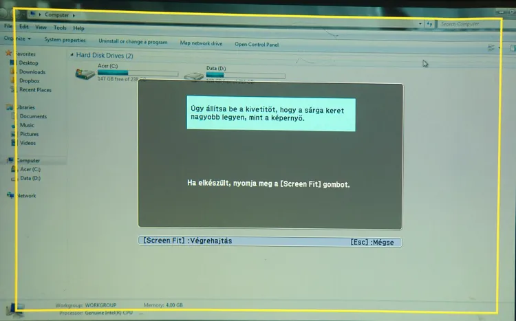 Egy jó prezentációs projektort nem kell hosszan állítgatni – ha ezt nézzük, akkor az Epson készüléke máris nyert, hiszen hamarabb elkészülünk beüzemelésével, mint hogy noteszgépünk betöltené a Windowst. Nem kell más tennünk, mint lerakni az asztalra, nagyjából beállítani, hogy a vászon felé nézzen, csatlakoztatni hozzá a számítógépet, majd bekapcsolni – a többit pedig elvégzi a beépített Screen Fit elektronika. Jelen esetben a többi az alábbi funkciókat takarja: automatikus élességállítás és automatikus trapézkorrekció függőlegesen és vízszintesen, valamint a képméret beállítása a vászon méretéhez.