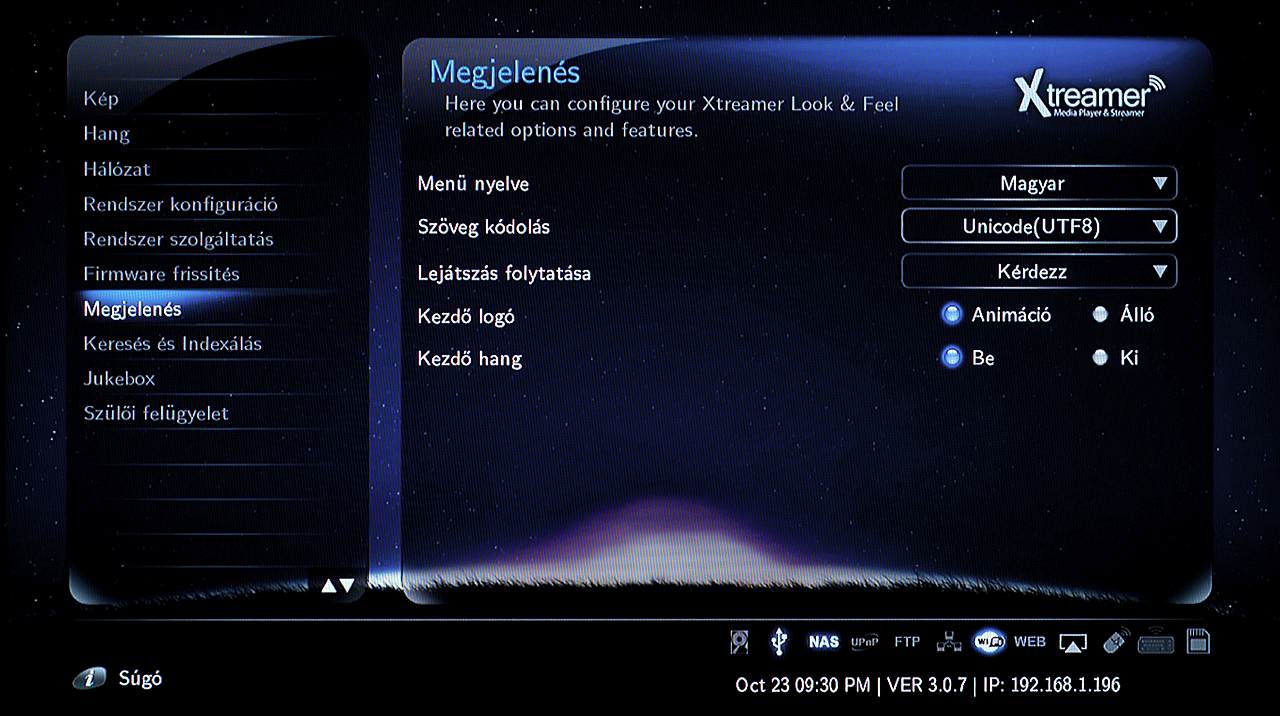 A készülék üzembe helyezése megegyezik a többi hálózati lejátszóéval: a kicsomagolás, a hálózathoz valamint a tévéhez, projektorhoz és erősítőhöz való csatlakoztatás valamint a tápegység bedugása után jöhet az első bekapcsolás. Ezután el kell végeznünk az alapbeállításokat: itt választhatunk nyelvet (természetesen magyart is), frissíthetjük a firmware-t, testreszabhatjuk a kezelői felület több elemét is, illetve a műsortárat (más néven Jukeboxot).