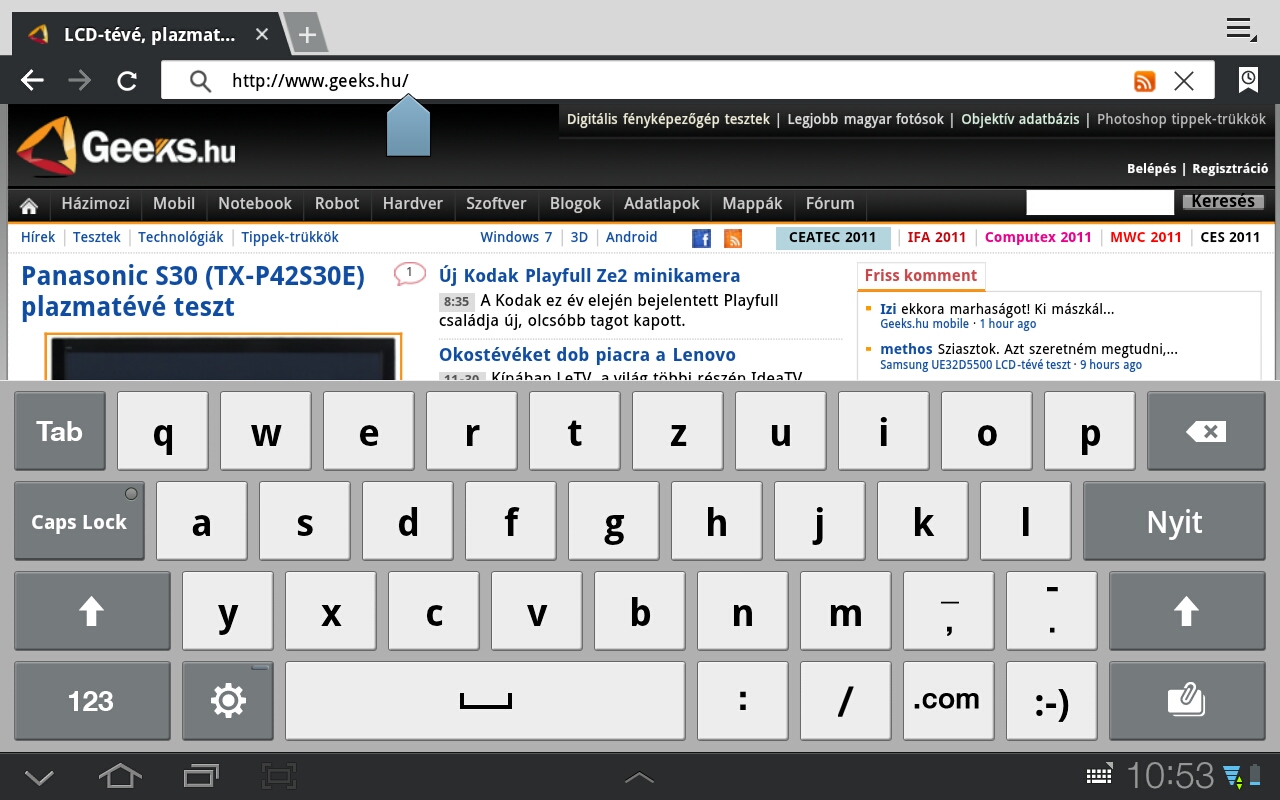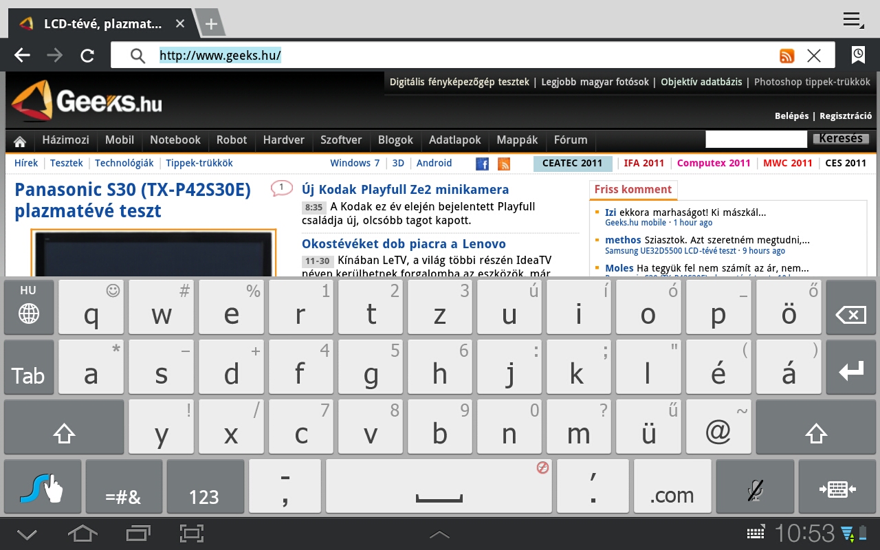 A másik alternatíva a beépített Swype billentyűzet, amely már teljes magyar karakterkészlettel bír, így egyből kattinthatók a hosszú magánhangzók is. A billentyűzet előnye, hogy nem kell pötyögni rajta, hanem elég egyetlen mozdulattal az ujjunkat végighúzni a klaviatúrán, és a szótárból a rendszer kiválasztja, hogy melyik szót akartuk begépelni – és a tapasztalatok szerint ez a magyar szavakkal is egészen jól megy.