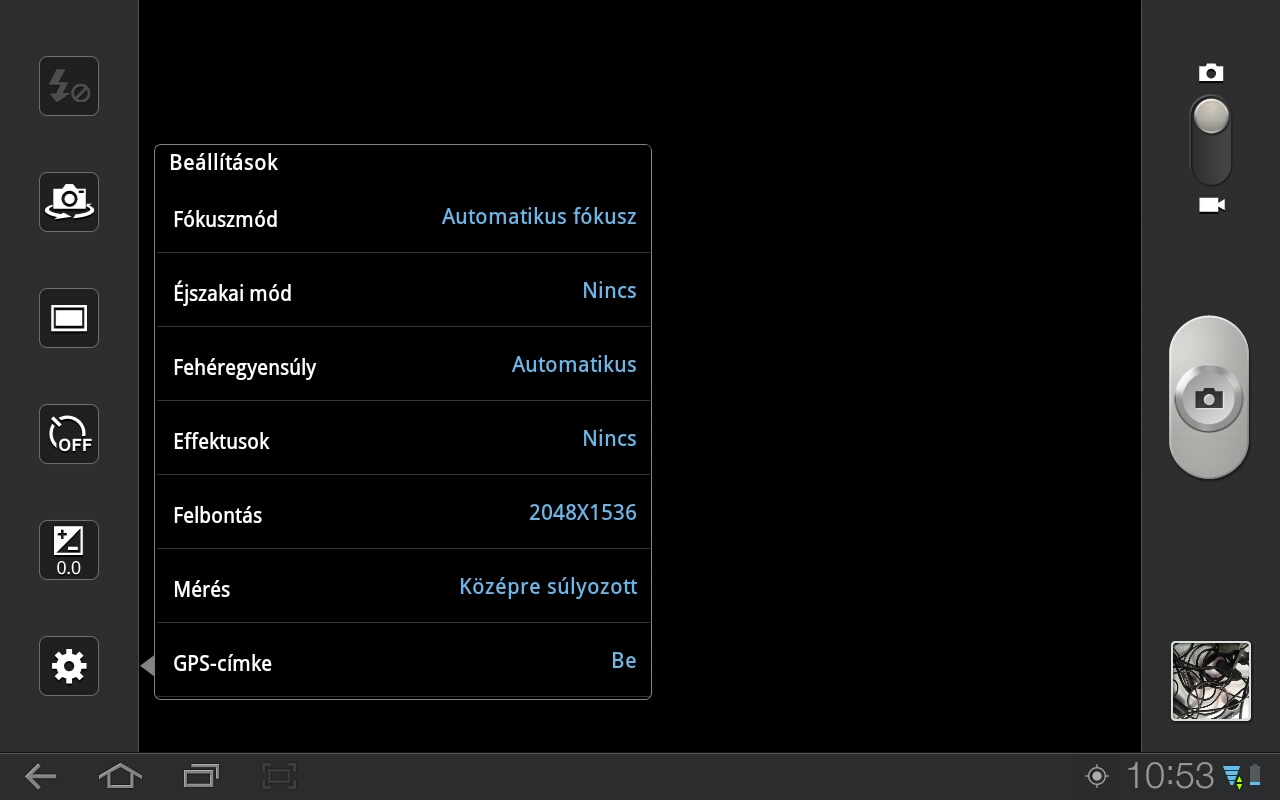 Amint azt korábban említettük, a Samsung Galaxy Tab 10.1v (P7100) 8 Mpixeles kamerája helyett a vékonyított P7500-as modellbe már csak egy 3 Mpixeles képérzékelő került. A maximálisan 2048×1536 pixeles felbontású képek minősége nem olyan jó, mint az előd esetében – amellett, hogy nyilván érthetetlen is, hogy miért került ilyen kicsi érzékelő a készülékbe.