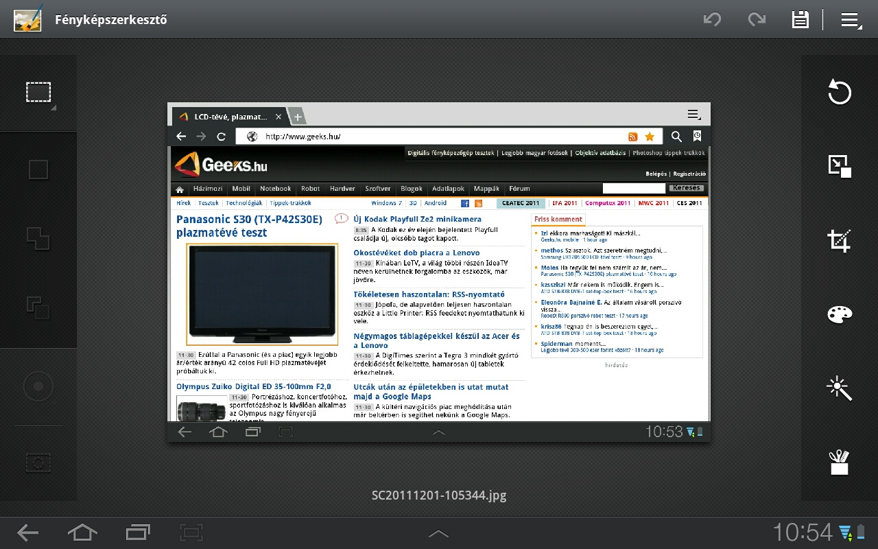 Alapszintű grafikus tulajdonságokkal megáldott képszerkesztő is megtalálható a Samsung Galaxy Tab 10.1-en. A nagyjából a windowsos Paint képességeivel bíró alkalmazásban méretezhetünk, körbevághatunk, kijelölhetünk, színbeállításokat módosíthatunk, effekteket adhatunk hozzá, vagy akár több képet is egymásba illeszthetünk.