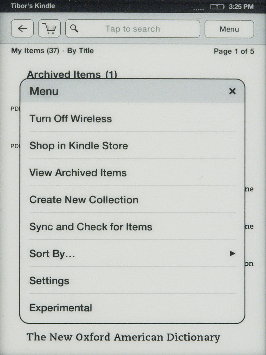 A kezdőképernyőn a Kindle-ön lévő könyveinket láthatjuk, illetve innen érhető el az archívum is. A műveket többféle szempont alapján csoportosíthatjuk, és rendezhetjük (pl. szerző, cím) is, valamint természetesen keresésre is van mód, ami nagyon jól jöhet, ha több száz könyvet másoltunk fel a Kindle-re. A keresés akkor is hasznos lehet, ha nem a könyvek között akarunk keresni, mert ez a funkció képes a Wikipedián és az interneten is szétnézni.