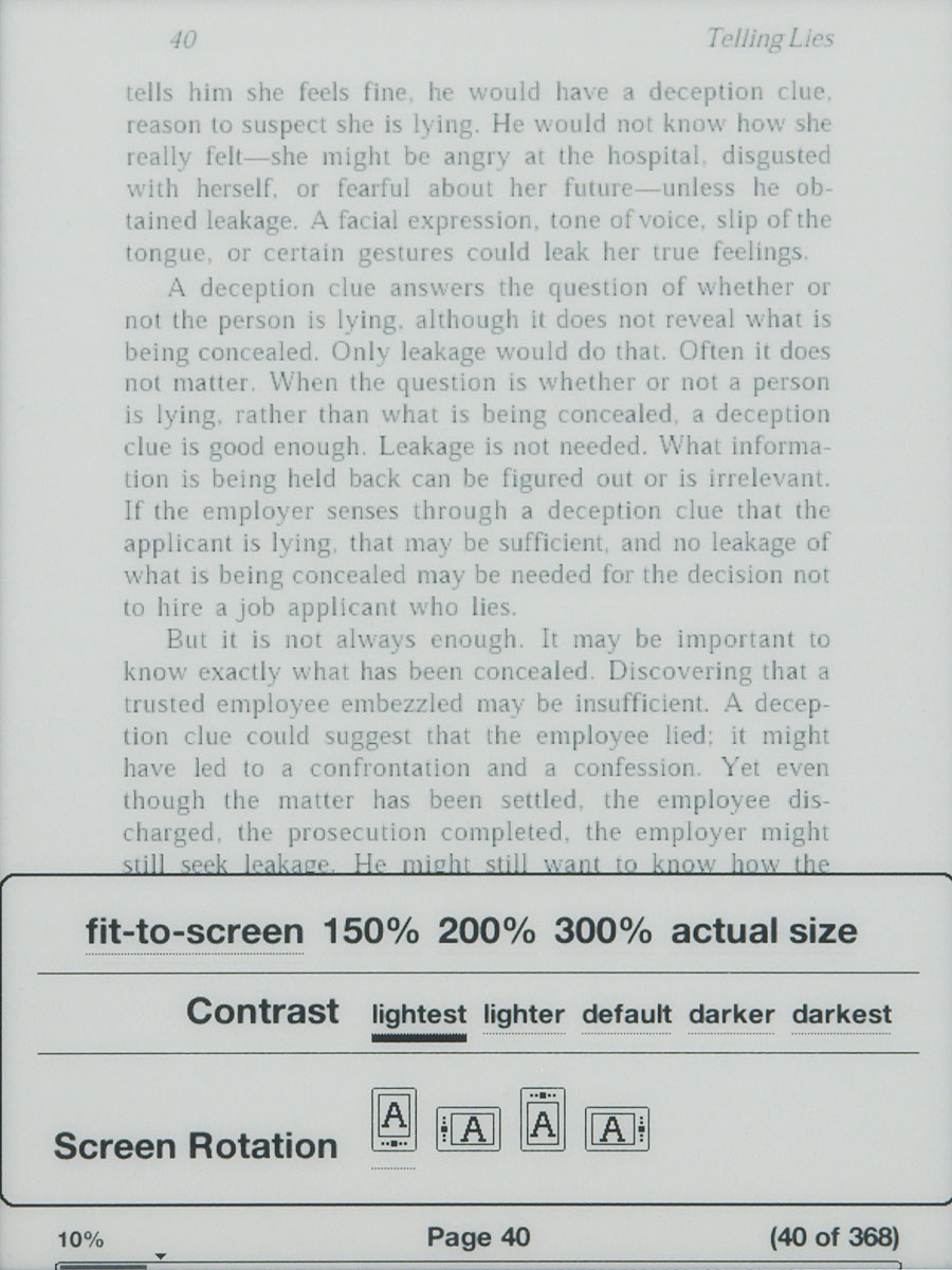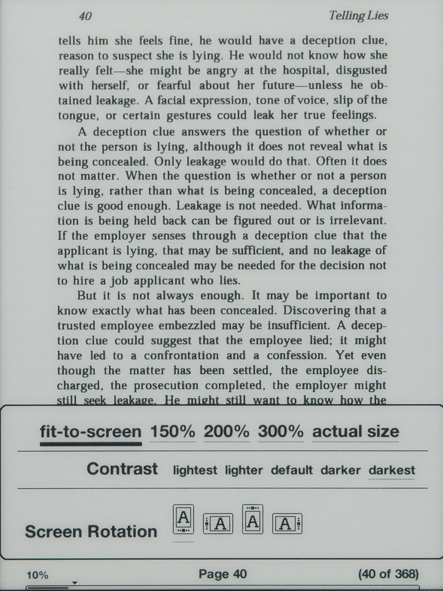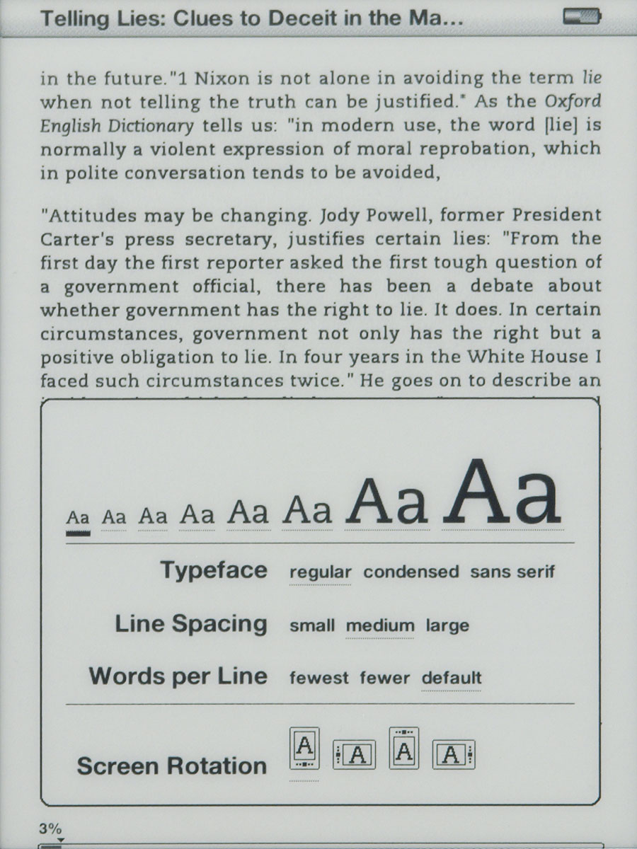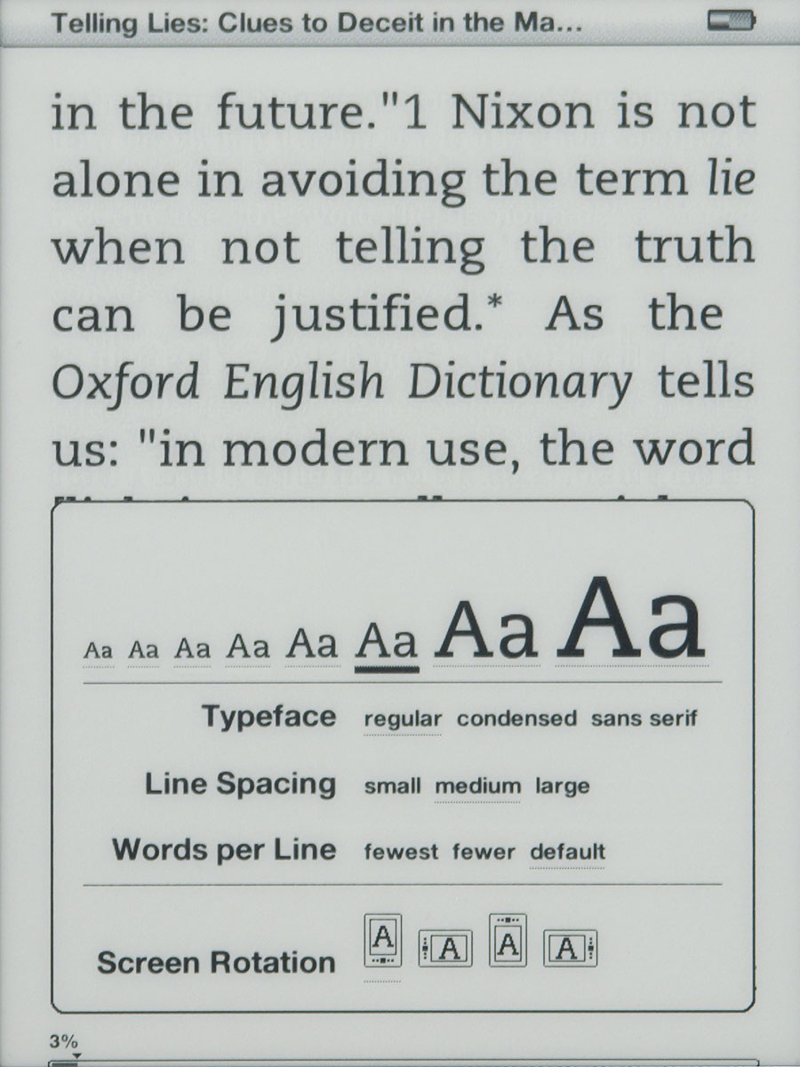 A legtöbb formátum esetében a betűméret, a betűtípus és a kontraszt is állítható, a PDF fájlok esetében azonban csak nagyítási lehetőség van. Ezt nem érdemes használni, mert könnyen belefuthatunk abba a hibába, hogy nem fér ki vagy a teljes sor vagy a teljes oldal a képernyőre. A megjelenítés módja ezzel a két lehetőséggel is egészen jól testre szabható, és még az idősek is találnak olyan betűméretet, amit könnyen látnak, mégsem csak néhány szó fér el a kijelzőn. Korábban már írtuk, hogy az E Ink kijelző a szemnek gyakorlatilag teljesen olyan mint a papír, ezért az olvasási élmény tényleg ugyanolyan, mint egy könyv esetében. A háttér nem tökéletesen fehér, de ez véleményünk szerint nem baj – a könyvek lapja sem véletlenül nem hófehér, a valamivel sötétebb szín a szem terhelését csökkenti. A technológiából adódóan fény viszont mindenképpen kell az olvasáshoz. A túl sok fény viszont nem hátrány; egyik Kindle sem fog zavarba jönni, ha mondjuk a strandon szeretnénk olvasgatni.