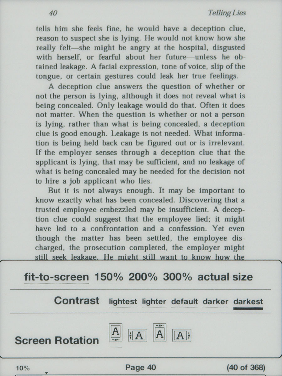 Ugyanakkor, mivel a két Kindle-t egyszerre kaptuk meg, és egyszerre bontottuk ki, azt vettük észre, hogy gyári állapot szerint a Kindle Touch esetében sokkal kontrasztosabbak a betűk – ám gyorsan kiderült, hogy ennek mindössze annyi volt az oka, hogy a kontraszt a Touch esetében maximumon volt, míg a Kindle 5-nél közepes értéken állt.