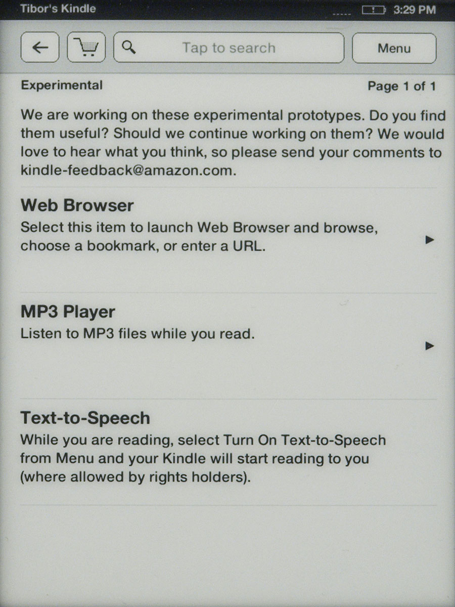 Érdekes módon a böngésző az első felbukkanása óta még mindig csak kísérleti szolgáltatásként található meg a Kindle-ökön, pedig a tapasztalatok szerint a kód meglehetősen stabil. Flash támogatás nyilván nincs, de a szövegeket és a képeket szépen jeleníti meg a Webkit alapú motor. A weboldalak alapesetben teljes képernyős nézetben töltődnek be, de van lehetőség nagyításra is (a Touch esetében a megszokott módon, két ujjunkkal) – ha kattintani akarunk, akkor pedig ez a lépés egyenesen szükséges is. A böngésző motorja képes arra is, hogy saját betűtípussal teljesen újratördelje a szöveget: ez a funkció éppen úgy működik, mint az okostelefoknál, segítségével a Kindle teljes szélességét kihasználhatjuk a cikkek olvasásakor.