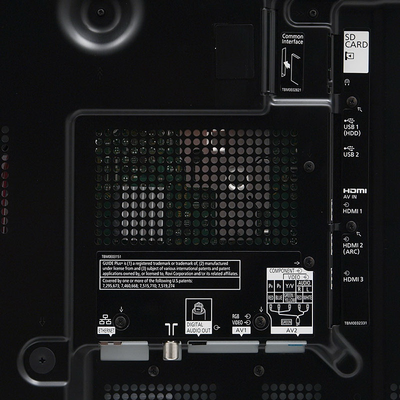 A csatlakozók mindegyike a tévé síkjával párhuzamosan áll. Alapvetően ugyanaz a kép fogad minket, mint a GT50-es sorozatba tartozó 42 colos tévé esetében, de három fontos különbség van: eggyel kevesebb HDMI és USB portot kapunk, valamint nincs DVB-S tuner sem. A HDMI-k és az USB-k viszont éppen ugyanúgy oldalra néznek, mint a nagytestvér esetében, mellettük pedig a fülhallgató kimenet, a kártyaolvasó valamint a CI adapterhez szükséges foglalatok találhatók. Lentről D-Sub, AV, komponens és SCART kábeleket csatlakoztathatunk, valamint a LAN kábelt illetve a tévéantennát. A TX-P42ST50-be analóg és digitális DVB-T/C tunerek kerültek.