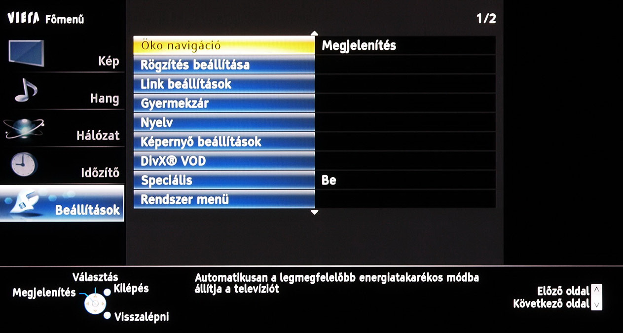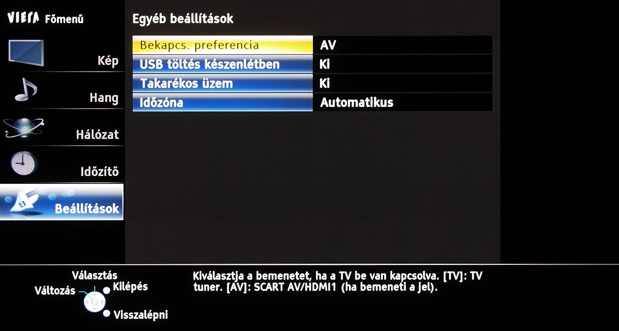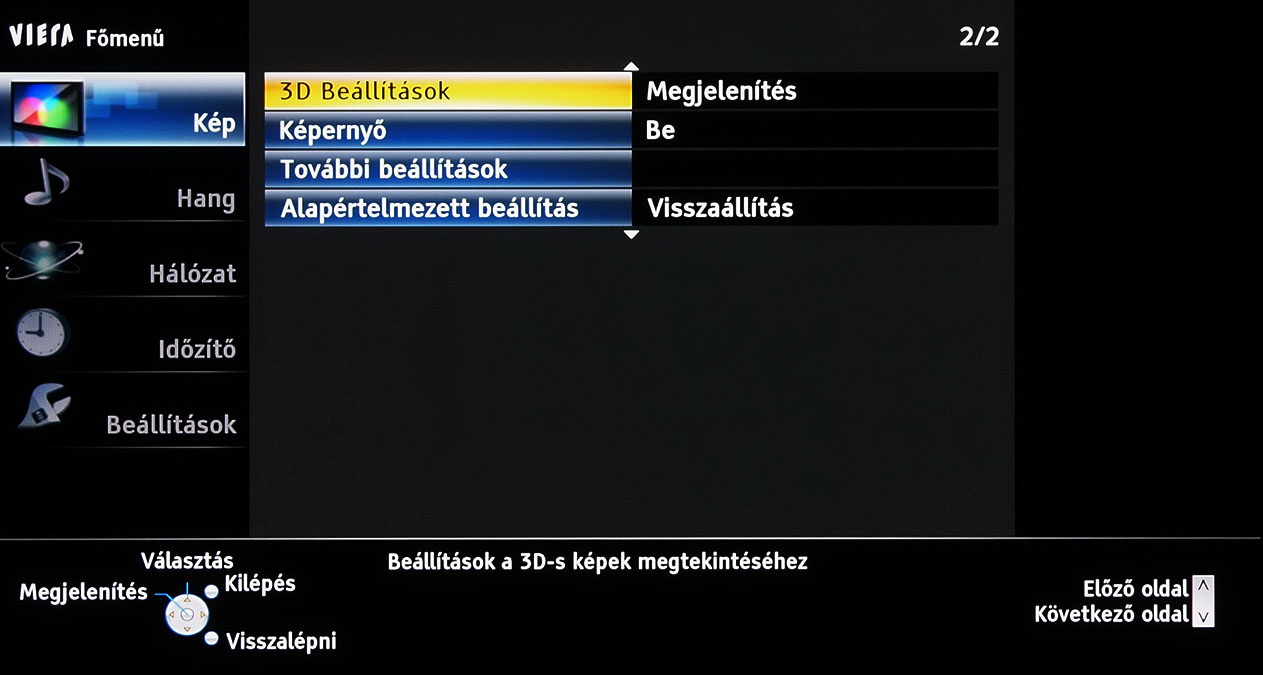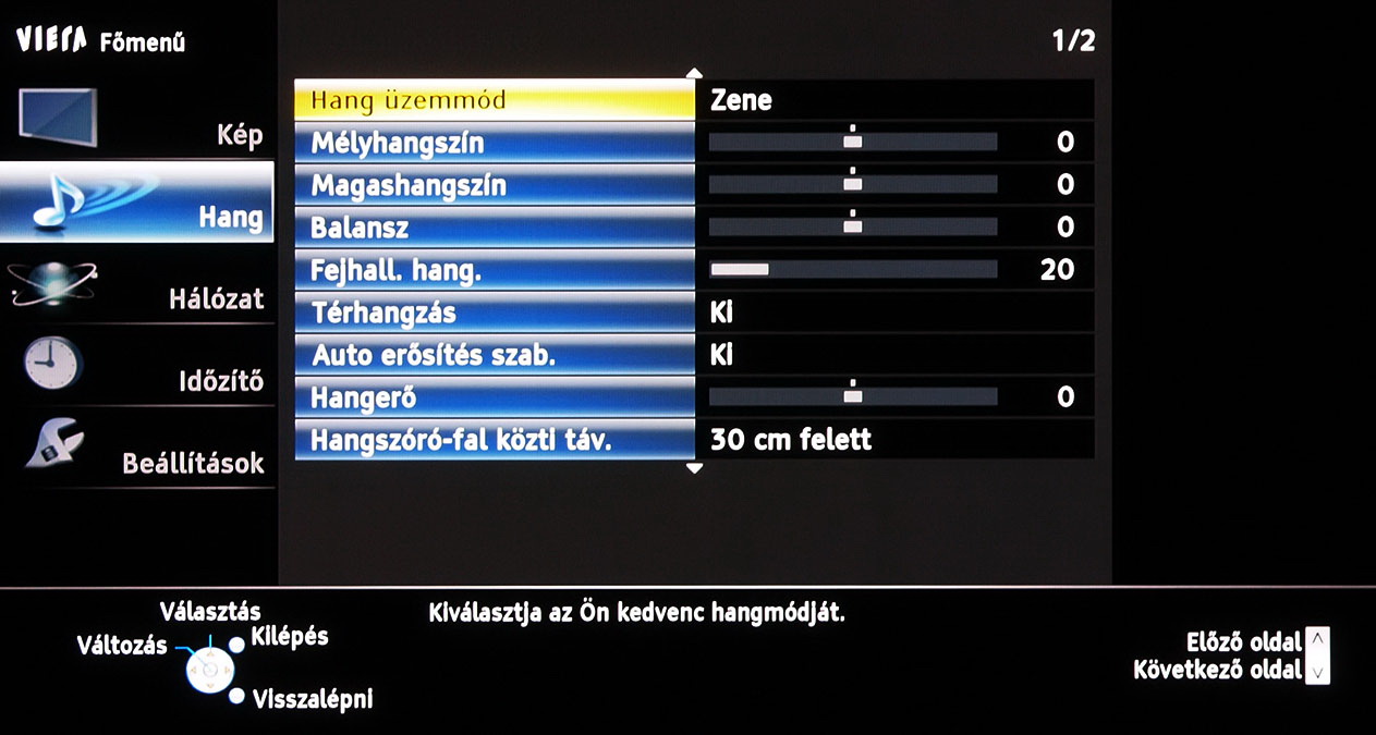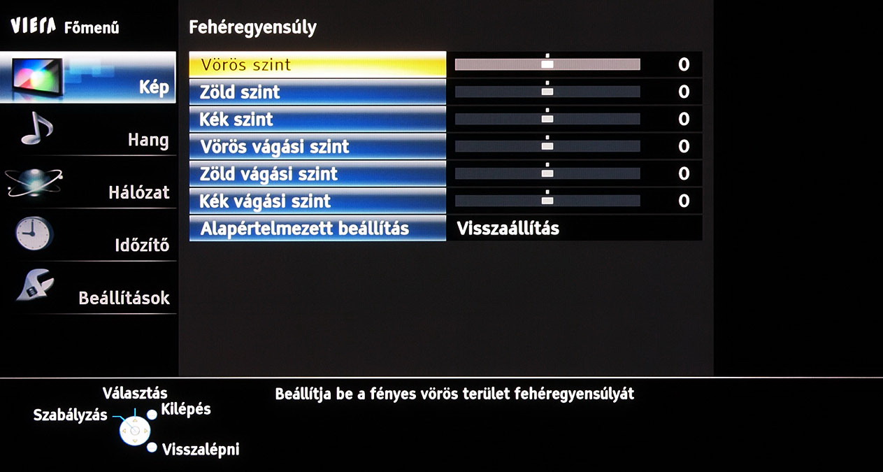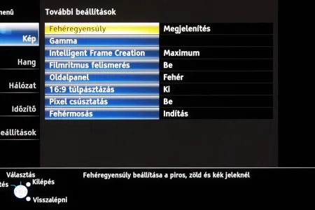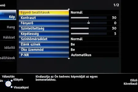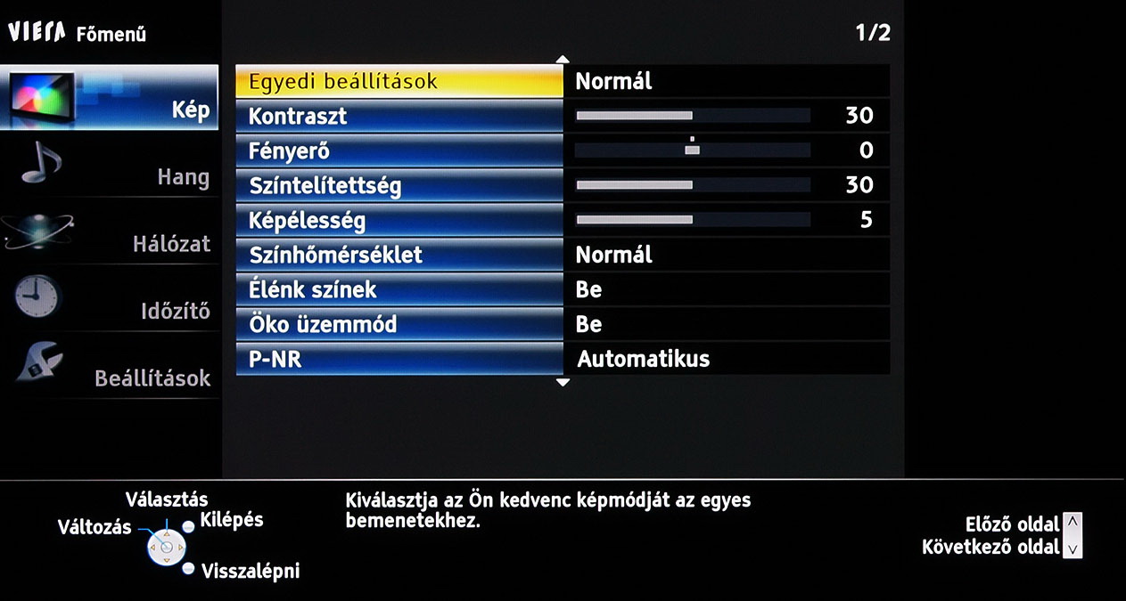 A menü felépítésén és elrendezésén 2011-hez képest nem változtatott a Panasonic, azonban az ST széria, végre valahára, több beállítási lehetőséget kapott. A legjobban annak örültünk, hogy lehet a gammát és a fehéregyensúlyt is állítani – igaz, a gamma esetében még így sem sikerült tökéletesre csiszolni a képet. A szegmentáció azért természetesen megmaradt a gyártó „olcsóbb” és drágább tévéi között, így az ST szériába már nem került be például a 1080 Pure Direct mód.
