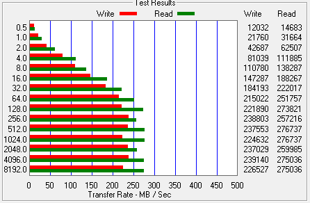A tesztelést ezúttal is a folyamatos adatátviteli sebesség mérésével kezdtük, ehhez pedig szokásos tesztprogramjaink segítségét kértük: az ATTO Disk Benchmarkkal és a HD Tune Próval kezdtünk. A SATA 3 Gbit/s-os interfész nyilván előrevetítette, hogy a meghajtó nem fogja megdönteni a sebességrekordokat, ugyanakkor, amint azt látni fogjuk, a SATA 3 Gbit/s-os interfészt azért a lehetőségekhez képes jól kihajtotta a Phison vezérlője. Az ATTO Disk Benchmark szerint az SSD olvasásnál 269, írásnál pedig 221 MB/s-os tempót ért el, ami a mai merevlemezekhez viszonyítva több, mint 100 MB-os előnyt jelent.