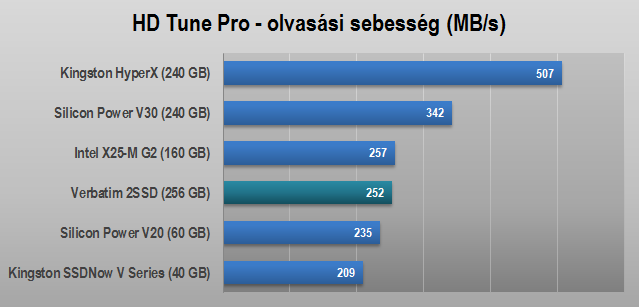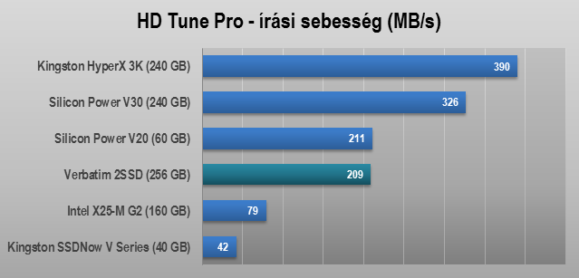HD Tune Pro alatt, mint szinte mindig, valamivel gyengébb eredményeket kaptunk, az olvasási tempó 252 MB/s körül alakult, míg az írás átlagos sebessége 209 MB/s volt. Egy SATA 3 Gbit/s-os meghajtótól ezek azért nem olyan rossz eredmények.