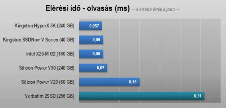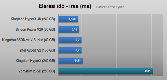 Egy SSD esetében azonban, főleg, ha az operációs rendszert is rá fogjuk telepíteni, a folyamatos írási/olvasási sebességnél sokkal fontosabb az elérési idő, ez határozza ugyanis meg azt, hogy a meghajtó egy másodperc alatt hány I/O művelet végrehajtására képes, gyakorlatilag tehát azt, hogy egy másodperc alatt hány fájlhoz tud hozzányúlni. Az IOMeter adatai szerint a Verbatim SSD-je nem jeleskedik igazán, 4K-s blokkoknál 0,31 ms-os elérési időt kaptunk olvasásnál és 0,81 ms-ot írás esetén. Ezekkel az adatokkal 3200 körüli IOPS adódik olvasás és 1200 körüli írás esetén – egyik sem számít kiemelkedően jó értéknek, sőt, még csak átlagosnak sem.