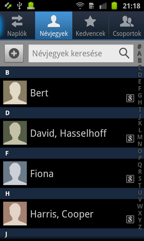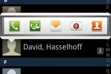 A többi androidos készülékhez hasonlóan a beírt betűkből, számokból a ténylegesen hívni kívánt ismerőst kitaláló Smart dial is megtalálható a mobilban, de a névlistában a TouchWiz felületnél megszokott ötletes extrákat is használhatjuk: egy kontakt nevén balra húzva az ujjunkat SMS-t küldhetünk, jobbra húzva felhívhatjuk, ha pedig a csatolt képre kattintunk, akkor egy gyorsmenü ugrik fel. Az SMS/MMS üzenetek tárolására és megjelenítésére a mobil az Androidnál megszokott párbeszédes formát használja.