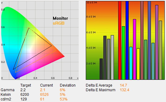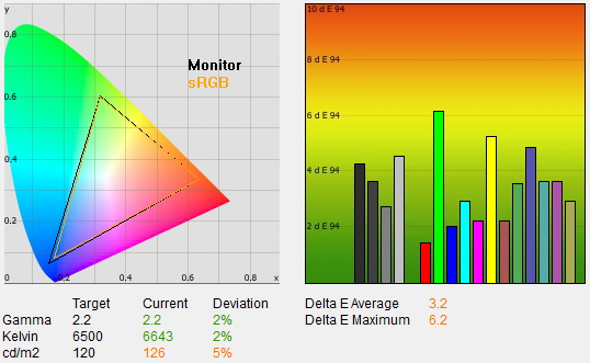 A legjobb beállításokat a profi színprofilból kiindulva az alábbi helyen találtuk meg: háttérfény 51, kontraszt 88, fényerő 49, képélesség 0-10 között, felbontástól függően (HD: 0, SD: 10). A képjavítóknál már több módosításra váró paraméter volt: árnyalat R4, dinamikus kontraszt ki, szuper felbontás ki, színskála normál, élkiemelő ki, gamma 2,2, zajcsökkentés ki, MPEG-zajcsökkentés ki, fekete szint magas (csak HDMI bemenetnél állítható), helyi sötétítés ki vagy alacsony, TruMotion ki. Ezekkel a beállításokkal 3,2-es átlagos deltaE-t, 2,2-es gammát, 6700K-s színhőmérsékletet és 126 cd/m²-es fényerőt kaptunk, a fekete fényerőssége pedig 0,12 cd/m² volt, a kontrasztarány így 1100:1-hez volt, ami egy IPS paneltől nem rossz teljesítmény.