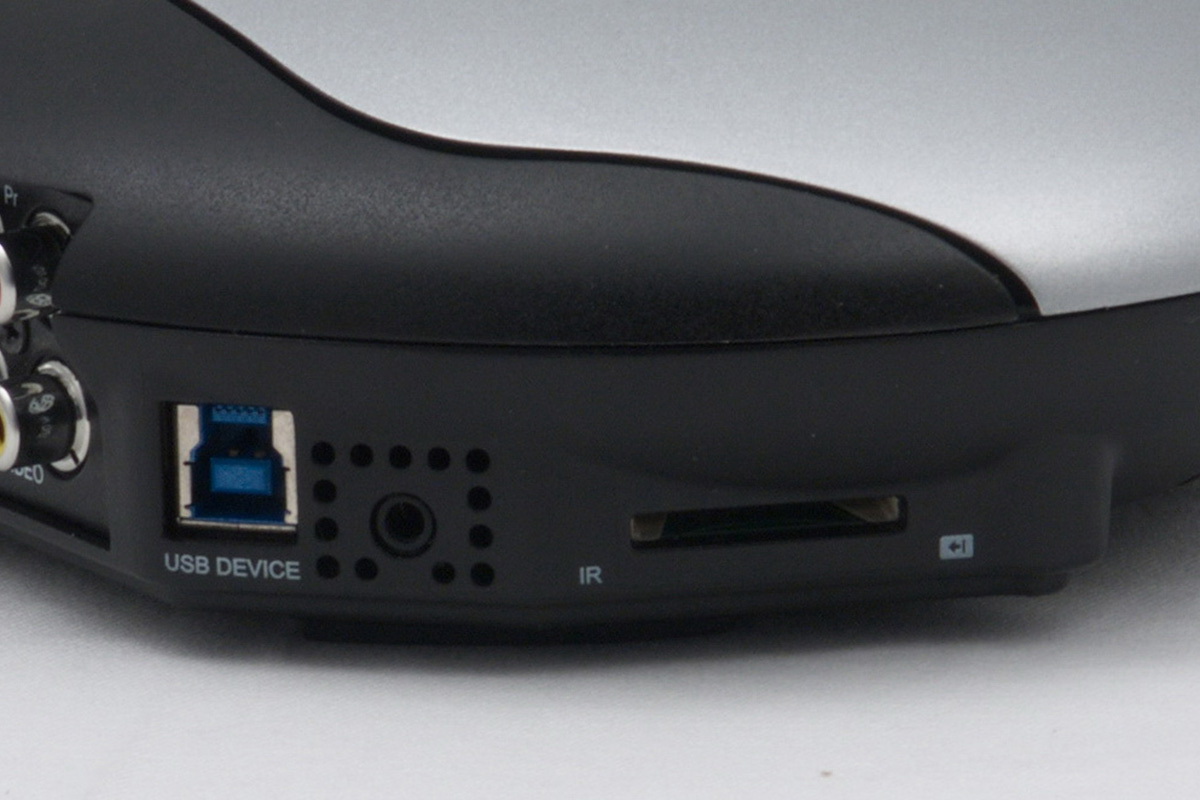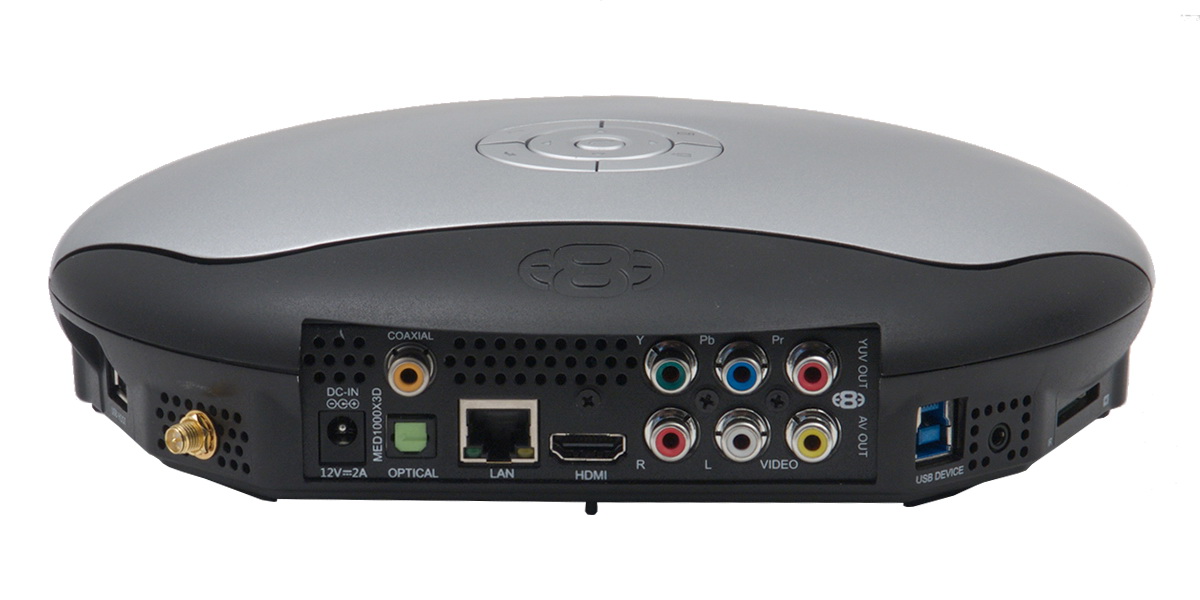 Hátul egész komplett csatlakozópanelt kapunk, amely minden olyan kimenetet tartalmaz, amire csak szükségünk lehet: HDMI 1.4, komponens és kompozit vidoekimeneteket, optikai, S/PDIF és sztereo RCA hangkimeneteket valamint gigabites Ethernet csatlakozót egyaránt kapunk. A MED1000X3D természetesen nemcsak vezetékes, hanem vezeték nélküli hálózatokra is képes csatlakozni (ehhez pedig egy jó nagy antennát is kapunk), a belső merevlemezt pedig USB 3.0 csatlakozó segítésével (is) megtölthetjük adatokkal. Nagyjából oldalra, de valamelyest hátrafelé néznek az USB host csatlakozók (kettő darab, jobb oldalt) és az SD-kártyahely; ezek természetesen arra szolgálnak, hogy alkalmanként külső merevlemezt, USB sticket vagy a fényképezőgép/vidoekamera memóriakártyájának tartalmát is meg tudjuk nézni.