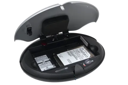 A MED1000X3D készülékháza fémből készült, aminek alapesetben örülni szoktunk, a felső, szürke színű rész viszont nem éppen a legigényesebb kialakítású. Különösebb baj nincs vele, de teljesen úgy néz ki, mintha műanyagból lenne – hiába, a kedvező ár mindig azt jelenti, hogy valahol kompromisszumot kell tudnunk kötni. A MED1000X3D nem tartozik a legkisebb médialejátszók közé, amelynek az egésze egyszerű oka az, hogy merevlemezt is építhetünk bele, ráadásul nemcsak 2,5 colos, hanem 3,5 colos meghajtó beszerelésére is van lehetőség. Az erre szolgáló fiókot a fedlap alatt találjuk meg – amelyet az „előlap” közepén lévő, háromszög alakú gomb megnyomása után nyithatunk fel. A HDD-t akár csavarok nélkül is beépíthetjük, de a stabilabb rögzítés érdekében érdemes fix rögzítést használni; a szerelés így sem lesz bonyolult és hosszadalmas.
