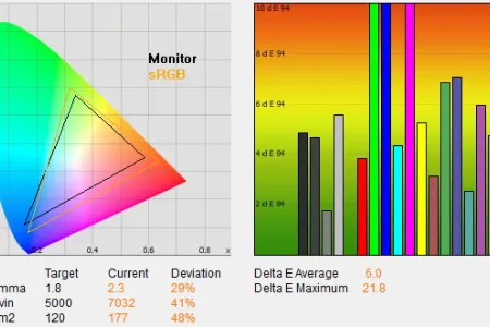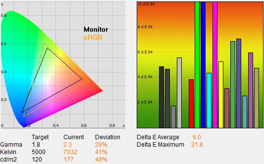 A teljesség kedvéért a notebook színhelyességét is lemértük (60%-os fényerő mellett). Az eredmény ugyan nem túl jó, de mivel nem profi felhasználóknak szánt notebookról van szó, ezt nem róhatjuk fel a Samsungnak – e tekintetben a Series 9 átlagosnak mondható. Már csak azért is, mert a lefedett színtartomány az sRGB színtartománnyal a notebookok többségénél köszönőviszonyban sincsen.