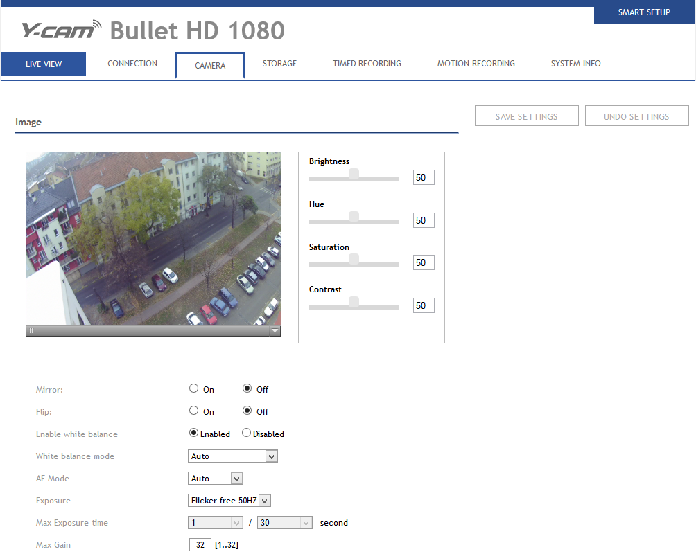 Az Y-Cam Bullet HD 1080 háromféle profil alapján tudja a képet továbbítani, akár párhuzamosan is. Az elsődleges opció mindenképpen Full HD felbontást és legfeljebb 30 fps képsebességet valamint 8 Mbps-os bitrátát kínál, H.264 vagy MJPEG tömörítés mellett. A másodlagos stream HD illetve 640×360 pixeles lehet, 20 fps és 4 Mbps-os adatsebesség mellett, míg a legkisebb, mobil eszközöknek szánt változat részletessége 320×180 pixel, 30 fps és 1 Mbps-os bitráta mellett. A képet természetesen lehet finomhangolni is: a fényerő, a színtelítettség és a kontraszt mellett állítható a fehéregyensúly valamint a gamma, kérhetünk ff és színes képet, valamint tükrözést is. Ez utóbbi természetesen azt a célt szolgálja, hogy a plafonra szerelt kamera képe is helyesen jelenjen meg. A Bullet HD 1080 sötétben az infra LED-ek segítségével lát – ezek működtetése lehet a környezeti fényerősségtől függően automatikus is, de beállíthatjuk kézzel is, hogy mikor kapcsoljon ki-be a segédfény.