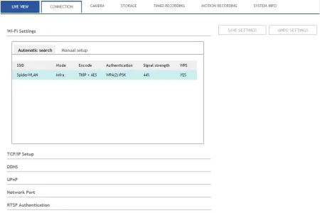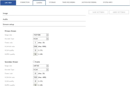 A kezelőfelületen a főbb menüpontokat fent találjuk meg; az egyes opciókat a gyártó egészen jól csoportosította, a felület rendezettnek mondható. Teljesen elégedettek mégsem lehetünk, mert a beállítási lehetőséget itt-ott nehézkesre sikerültek, és többször is feleslegesen kell kattintanunk ahhoz, hogy egy-egy paramétert elérjünk. Az egyes opciókat a gyártó öt csoportba sorolta: kapcsolatok, kamera, adattárolás, időzített felvétel és mozgásra aktiválódó felvétel. Ezeken kívül a felső menüből az előnézeti képet valamit a rendszerinformációs ablakot is elérhetjük.