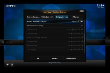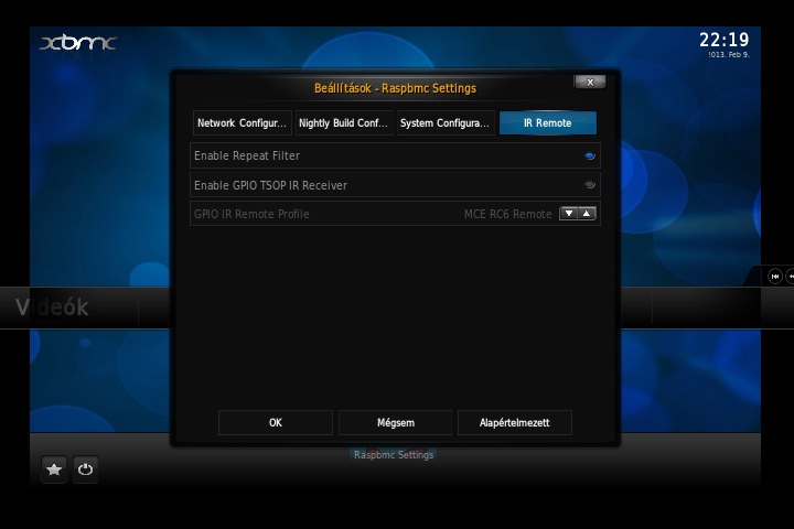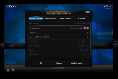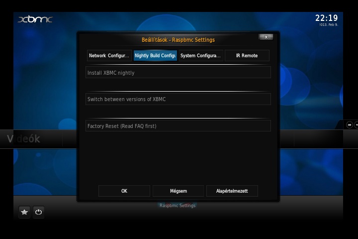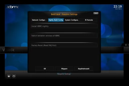 A teszt idején ez volt az egyetlen rendszer, aminél már elérhető volt a végleges, 12-es verziójú (Frodo) XBMC. A Raspbmc egy 19-éves angol srác által erre a feladatra és hardverre optimalizált Debian rendszer, ami bármilyen debianos csomaggal szabadon bővíthető. Windows rendszeren egy grafikus felületen futó telepítő alkalmazás, Macen és Linuxon egy python szkript intézi a telepítést. A folyamat gyorsan le is fut, aminek eredménye egy Raspberry Pi-on bootolható rendszer, a hátránya hogy a folyamatot a Raspberry Pi-on kell folytatni. A telepítés második fázisában ennél a rendszernél internet kapcsolatra is szükség van, de teljesen önállóan, külső beavatkozás nélkül 15 perc alatt végez a telepítő (gyengébb internet kapcsolatnál nyilván tovább tart a folyamat). Első indulásnál a Raspbmc nagyon intelligensen nyelvválasztó képernyővel fogad, ami után már a kiválasztott nyelven (esetünkben magyarul) indul újra, és a magyar nyelvű feliratok megjelenítésével sem volt gond. A másik két rendszerhez hasonlóan a perifériák felismerése sem jelentett problémát.