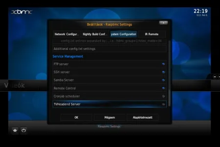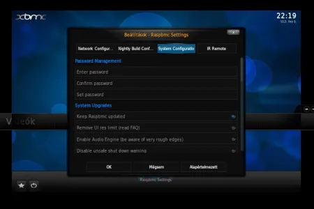 Az operációs rendszer kezelőfelülete a Programok menüpont alá került (de a főmenü alatt bármikor elérhető), és a három közül a legtöbb opciót kínálja. A hálózat és az egyéb szolgáltatások (FTP, Samba, SSH) bekapcsolása mellett a Raspberry Pi túlhajtására is lehetőséget biztosít. Kimondottan szimpatikus megoldás, hogy az MPEG2 videó és VC1 hang dekódolásához a Raspberry Alapítványtól külön megvásárolható licencek kódjai itt a felületen is beírhatók. A Raspbmc másik pozitív szolgáltatása, hogy képes önmagát automatikusan frissíteni, így a rendszer külön beavatkozás nélkül is folyamatosan naprakészen tartható.