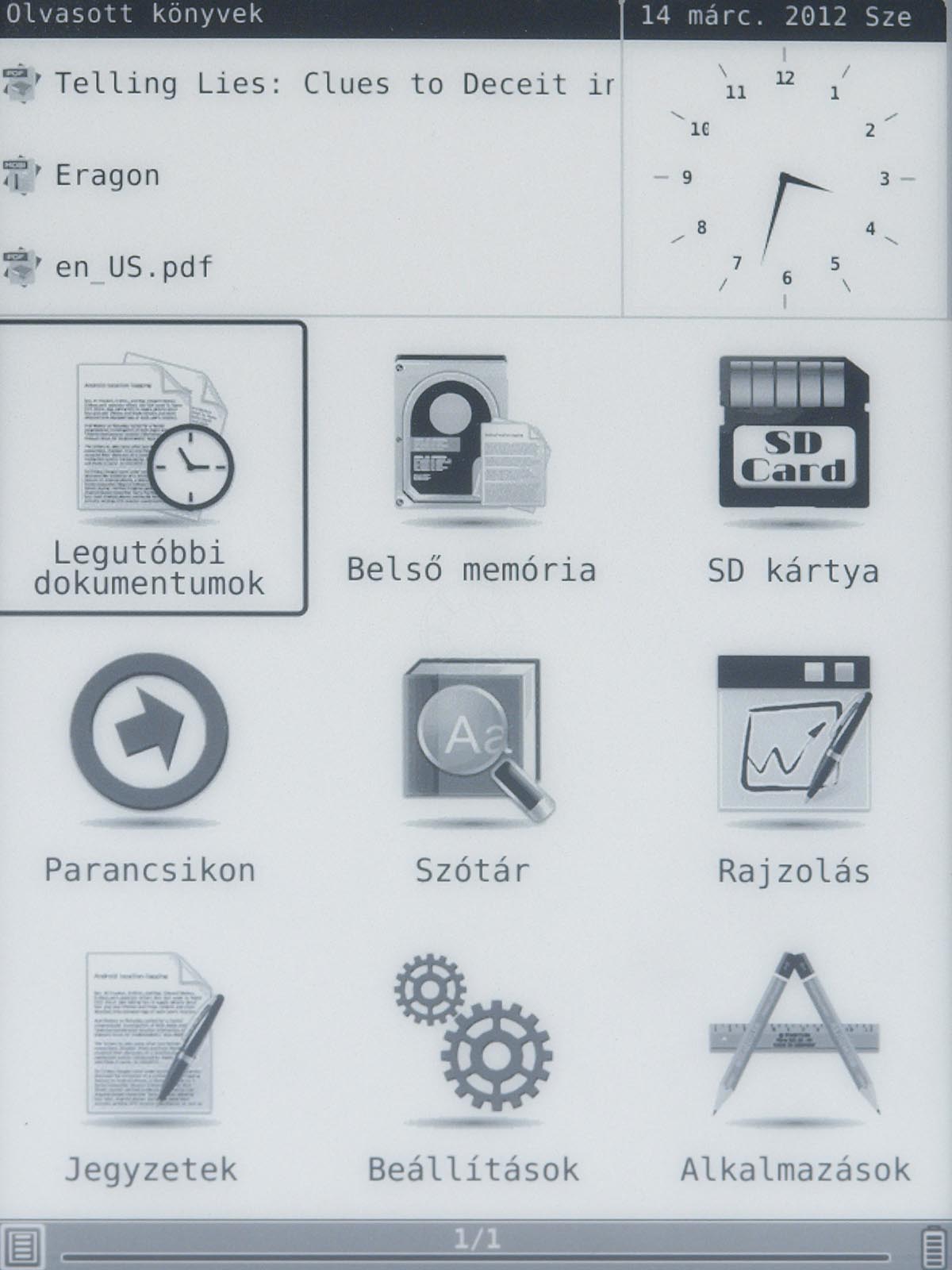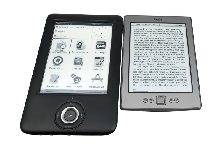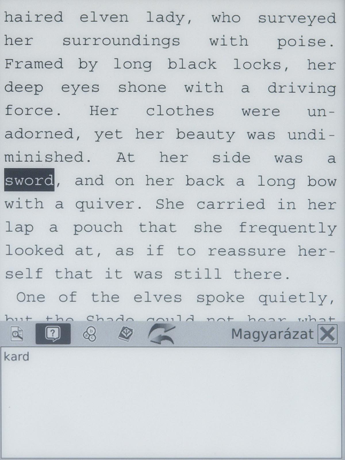 A dokumentumokban a navigáció gyors és egyszerű: a külső gyűrű bal is jobb felével tudunk vissza és előre lapozni, az OK gomb megnyomása után pedig beírhatjuk annak az oldalnak a számát, amelyikre át szeretnénk ugrani. Erre egyébként a gyakorlatban nem sokszor lesz szükségünk, mert a készülék természetesen megjegyzi, hogy a könyveket hol hagytuk félbe, és a legközelebbi megnyitásnál automatikusan a folytatáshoz ugrik. A könyvek tartalmában lehet keresni is, és szótár segítségét is igénybe vehetjük – a fordítást egyszerűen csak a szó bekarikázásával kérhetjük. A beépített szótárra ugyanakkor nem életbiztosítás hagyatkozni, mert a tapasztalataink szerint sokszor még magyar-angol viszonylatban sem kapunk releváns találatokat. Ezt ellensúlyozza, hogy a készülék kezeli a StarDict formátumot, így tudása e szempontból bővíthető.