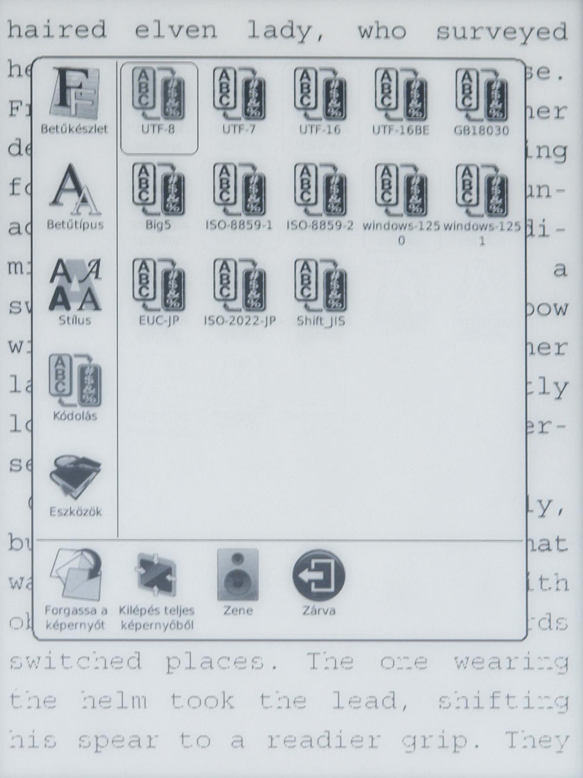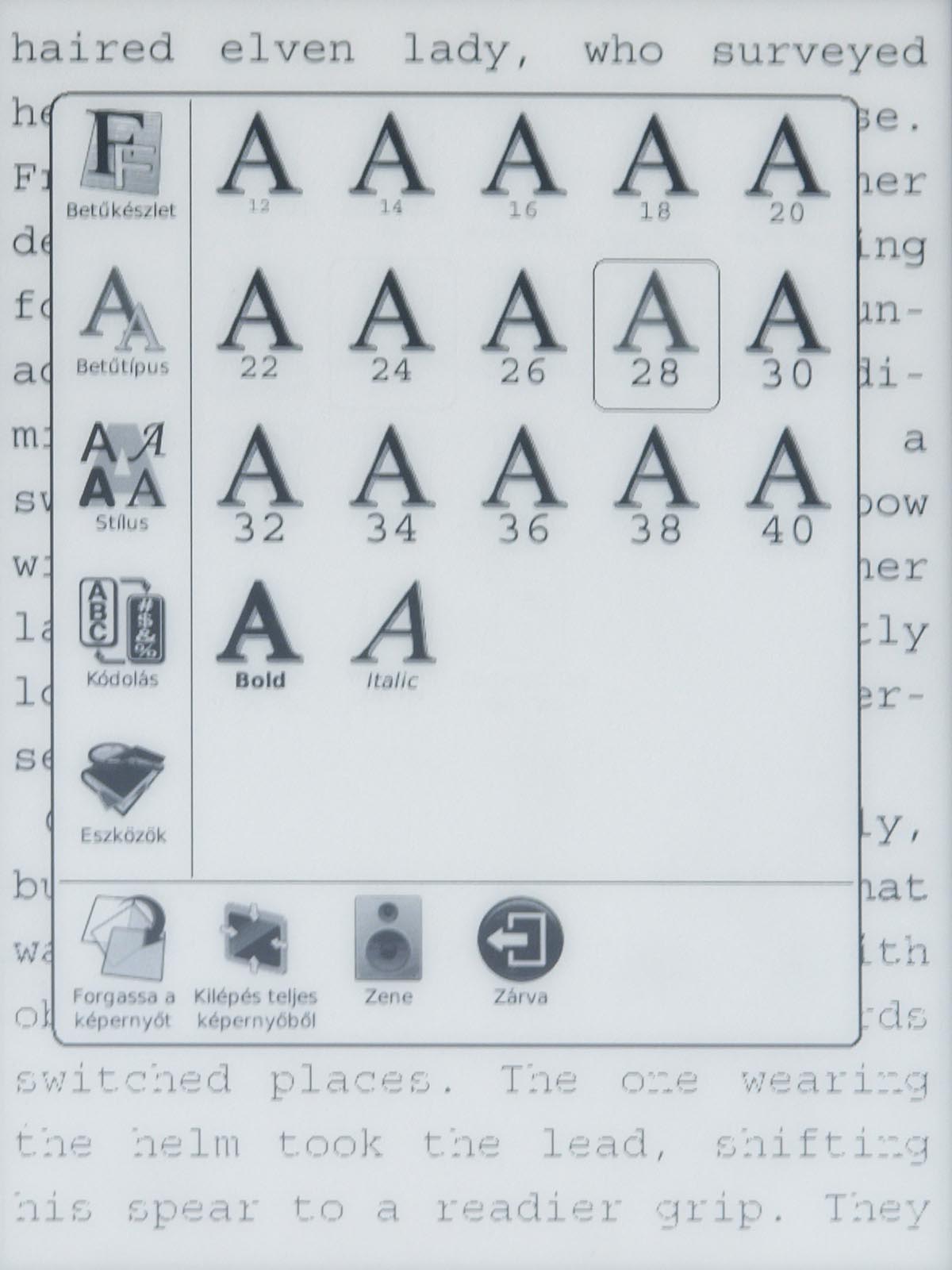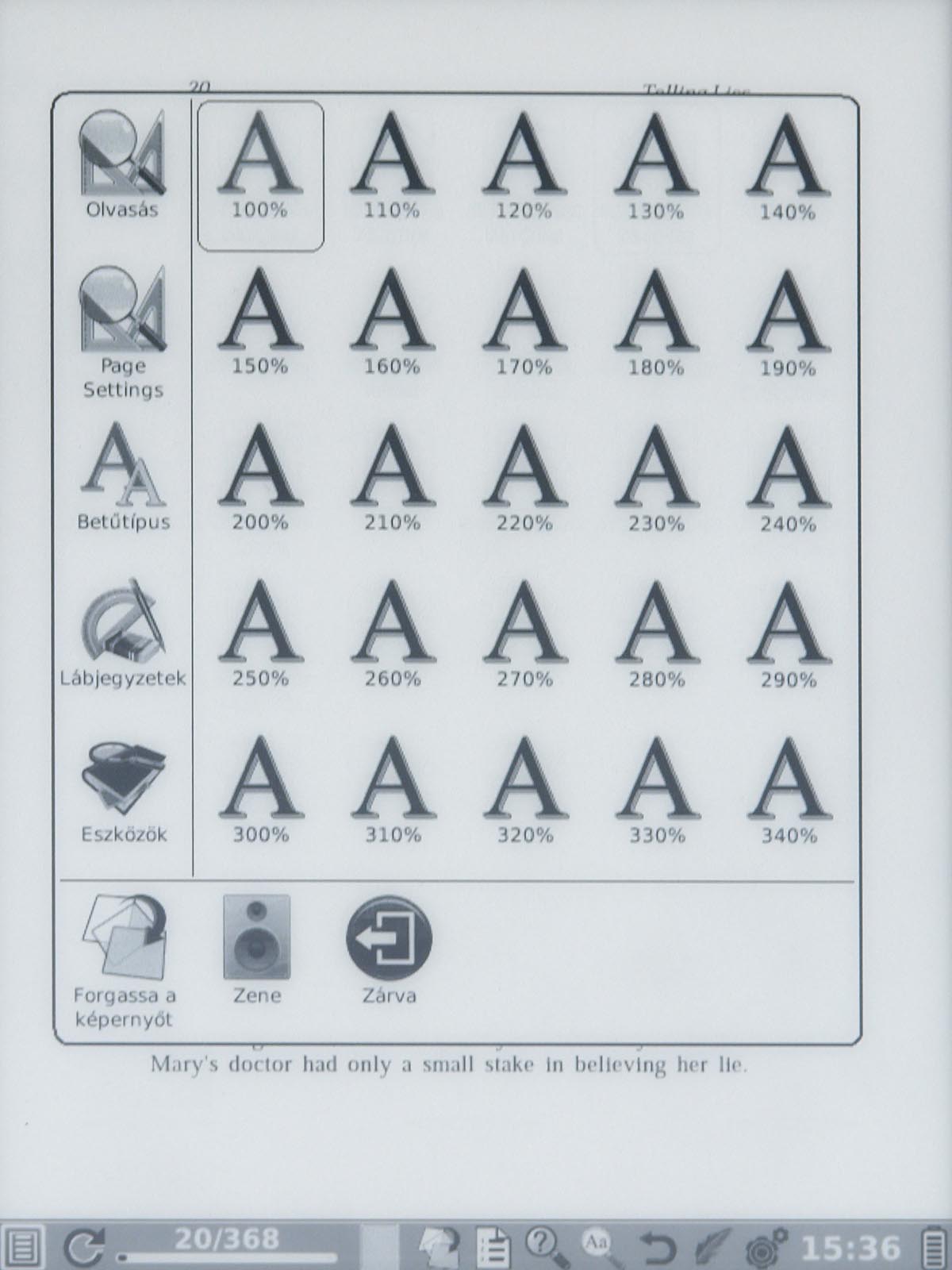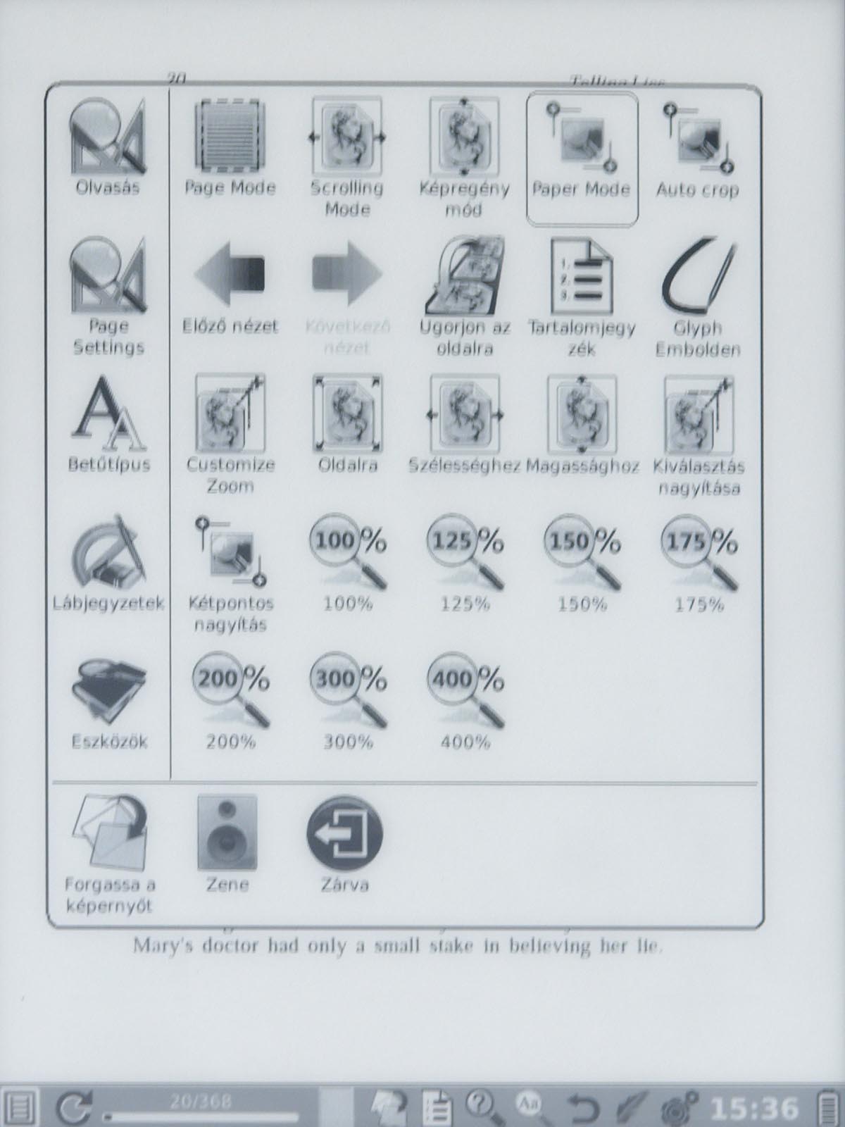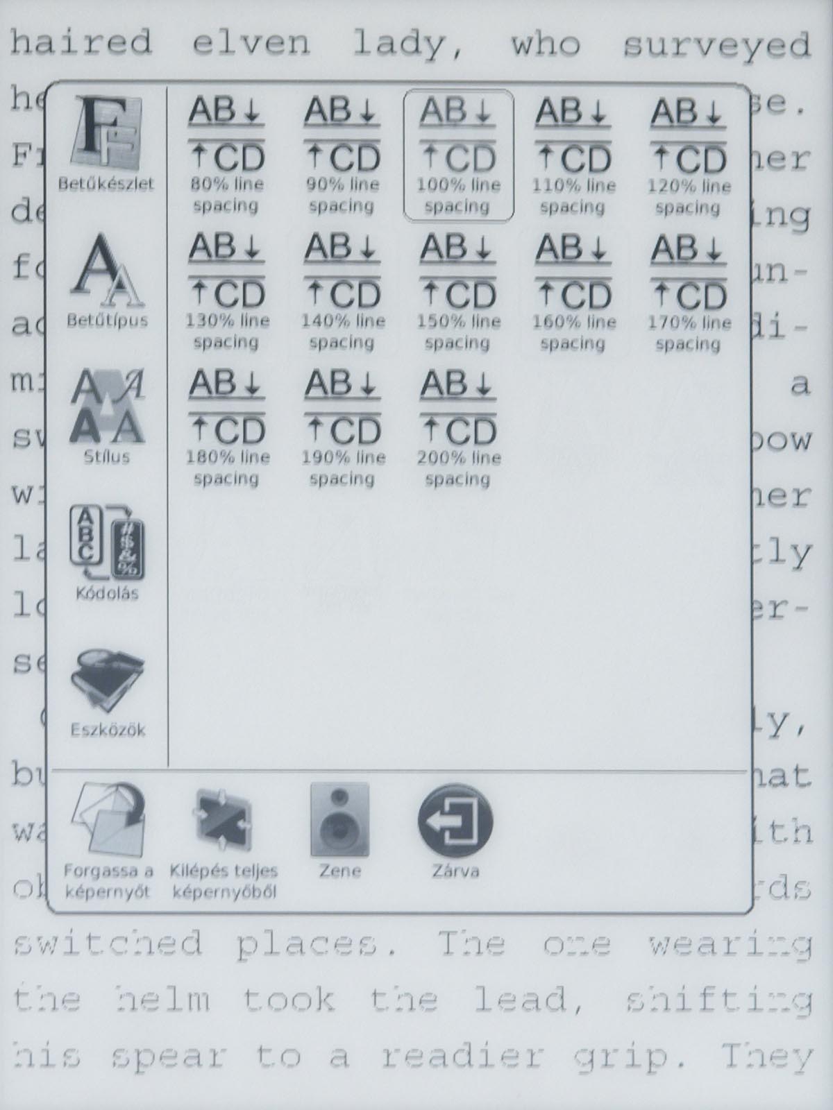 Ezeket az opciókat a menü gomb segítségével érhetjük el, mint ahogyan a menü gomb megnyomása után van lehetőségünk arra is, hogy a betűméretet, a sortávot, a nagyítást stb. beállítsunk. Ezek természetesen nem nehéz műveletek, de a menü lomhasága adott esetben azért tud bosszúságot okozni. Szerencsére a könyvek megnyitása nem lassú, még a 4-500 oldalas könyveket is néhány másodperc alatt betölti a készülék.