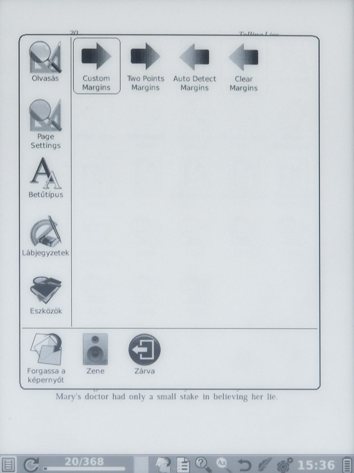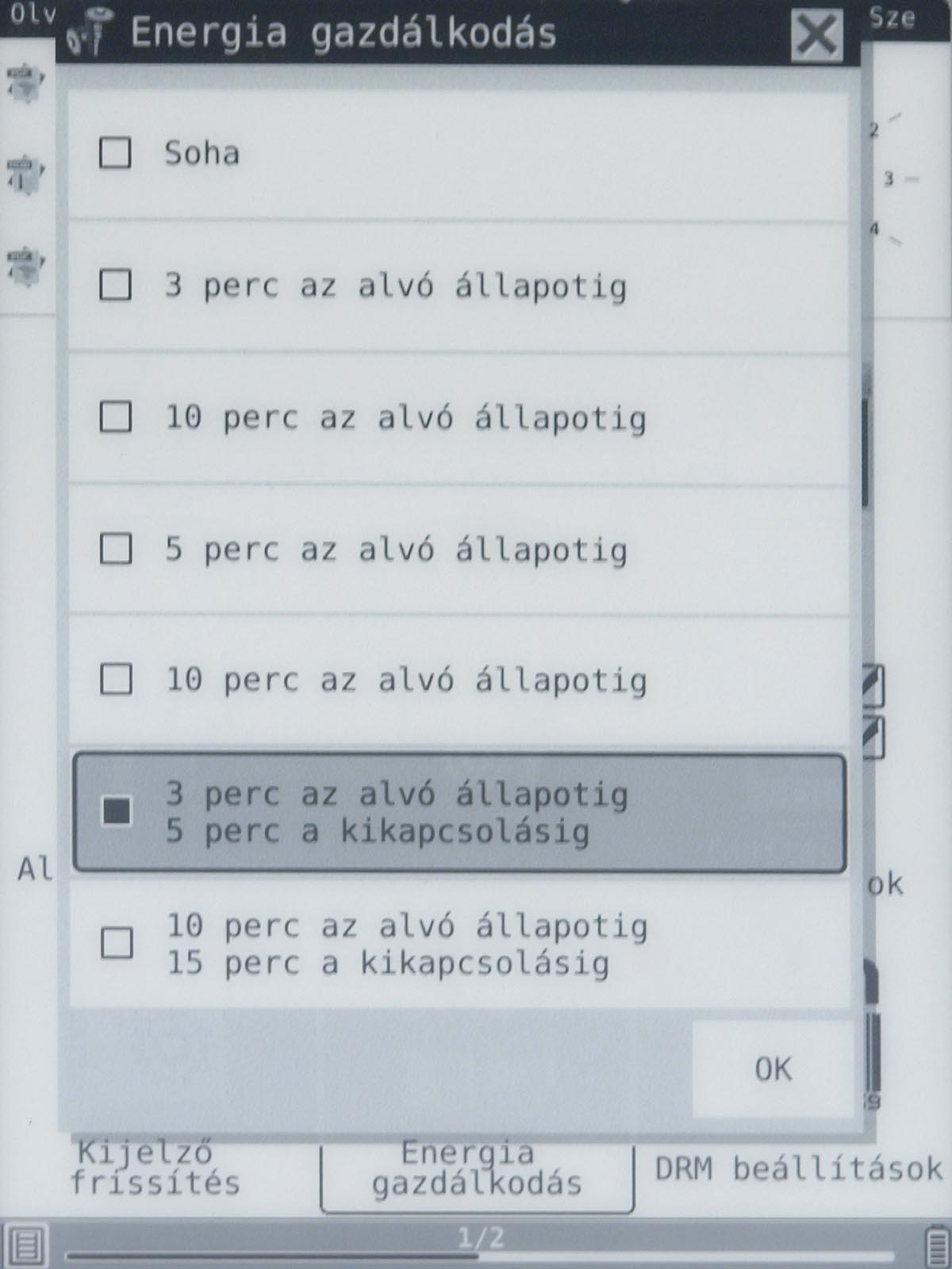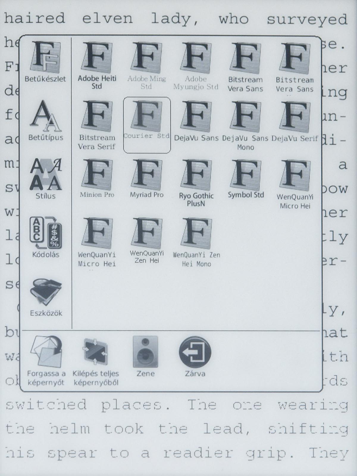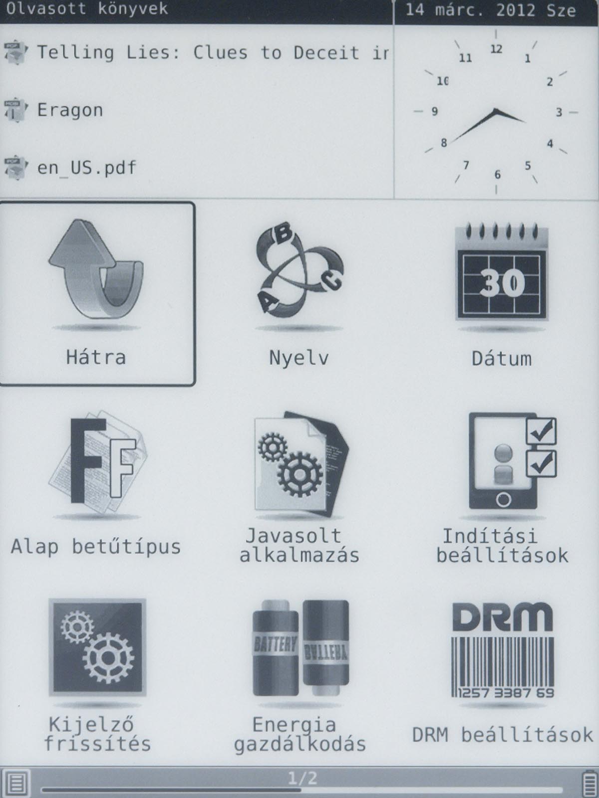 Ezeket az opciókat a menü gomb segítségével érhetjük el, mint ahogyan a menü gomb megnyomása után van lehetőségünk arra is, hogy a betűméretet, a sortávot, a nagyítást stb. beállítsunk. Ezek természetesen nem nehéz műveletek, de a menü lomhasága adott esetben azért tud bosszúságot okozni. Szerencsére a könyvek megnyitása nem lassú, még a 4-500 oldalas könyveket is néhány másodperc alatt betölti a készülék.