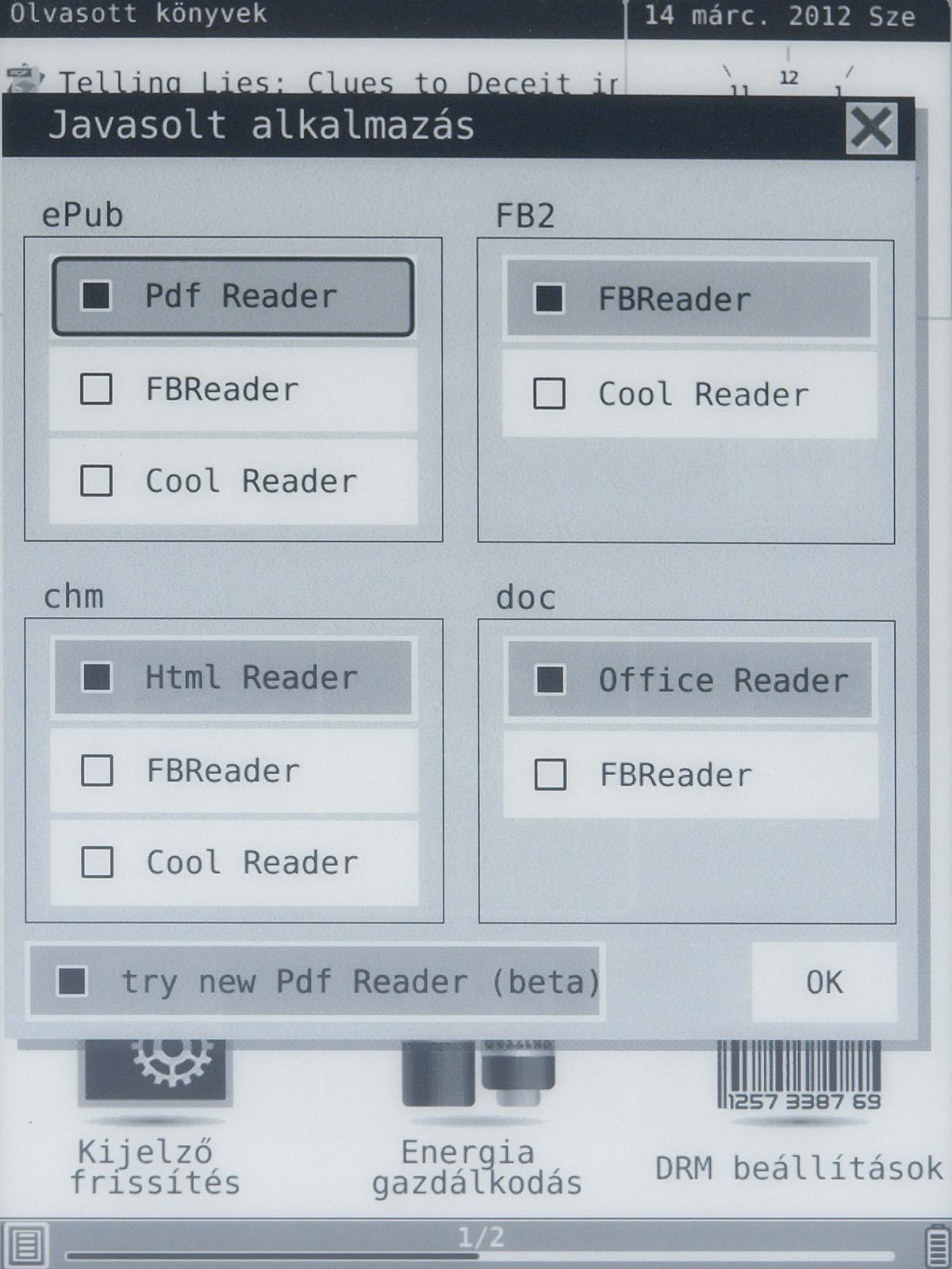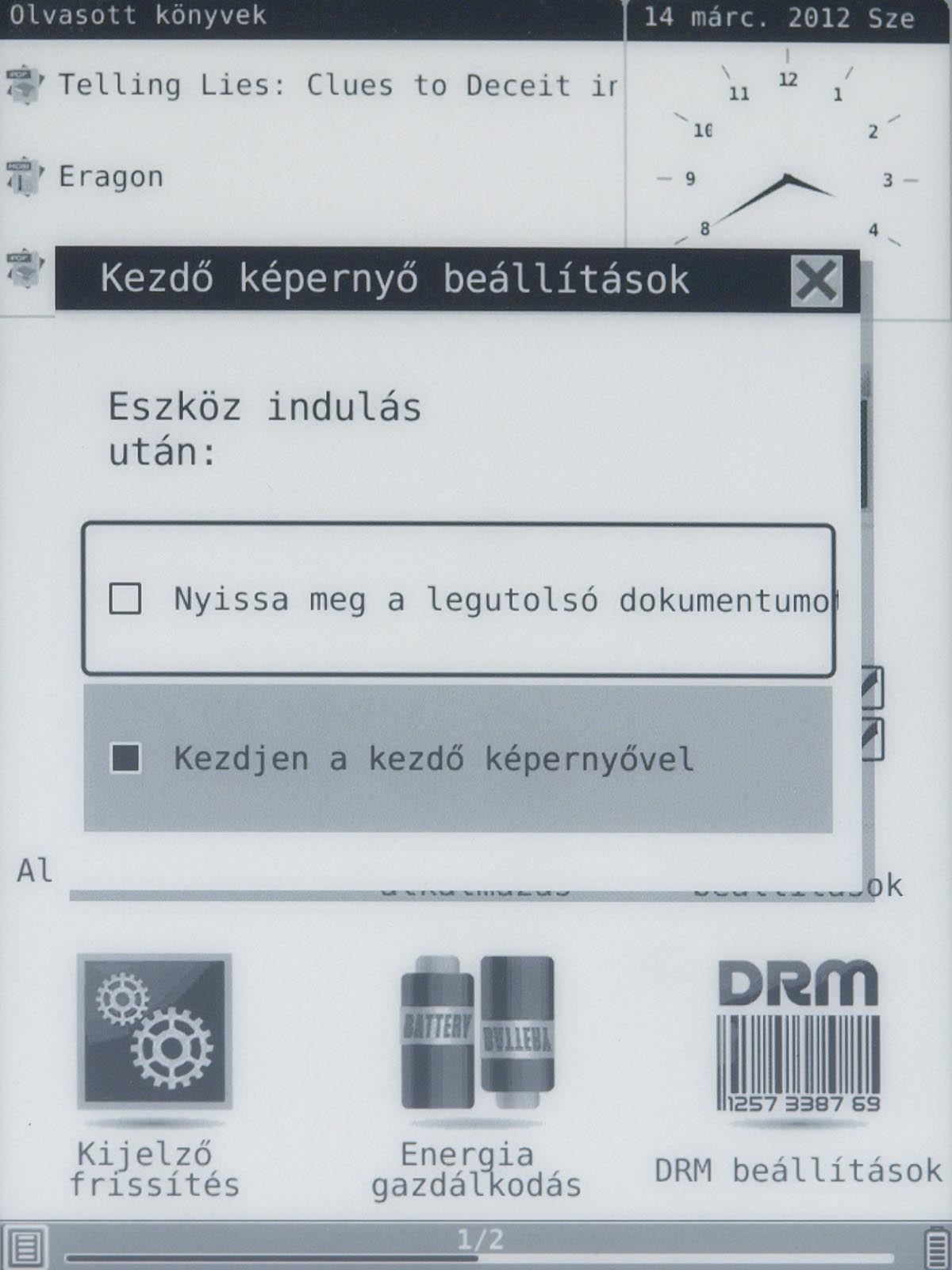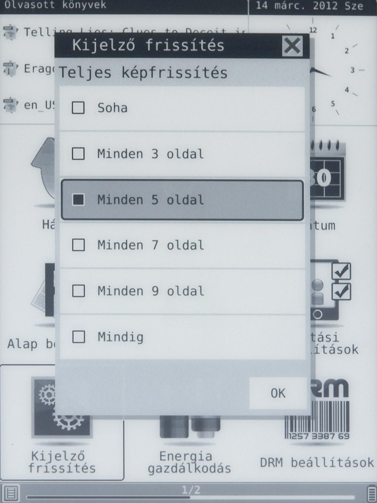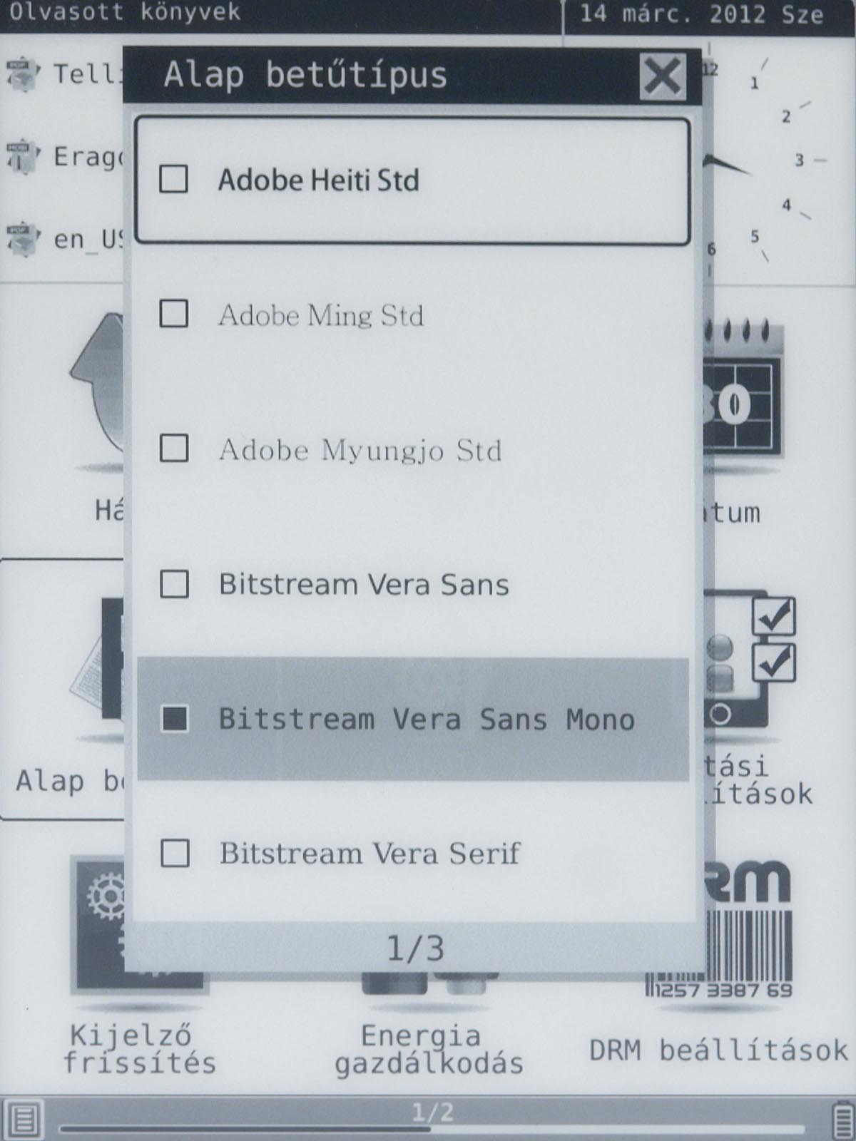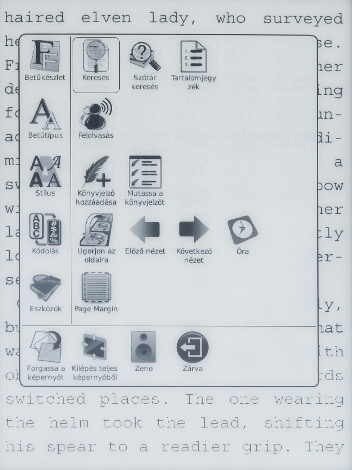 Ezeket az opciókat a menü gomb segítségével érhetjük el, mint ahogyan a menü gomb megnyomása után van lehetőségünk arra is, hogy a betűméretet, a sortávot, a nagyítást stb. beállítsunk. Ezek természetesen nem nehéz műveletek, de a menü lomhasága adott esetben azért tud bosszúságot okozni. Szerencsére a könyvek megnyitása nem lassú, még a 4-500 oldalas könyveket is néhány másodperc alatt betölti a készülék.