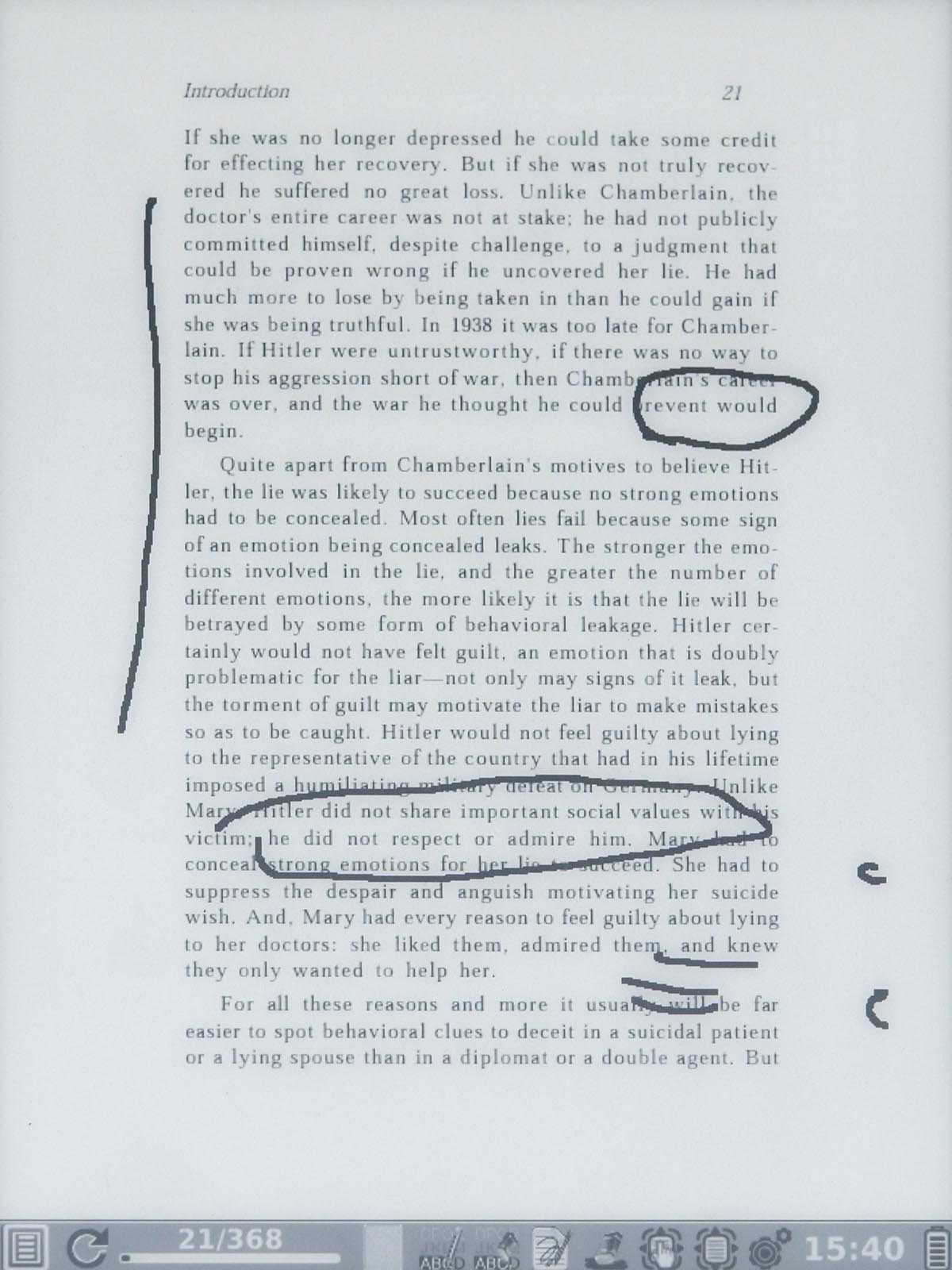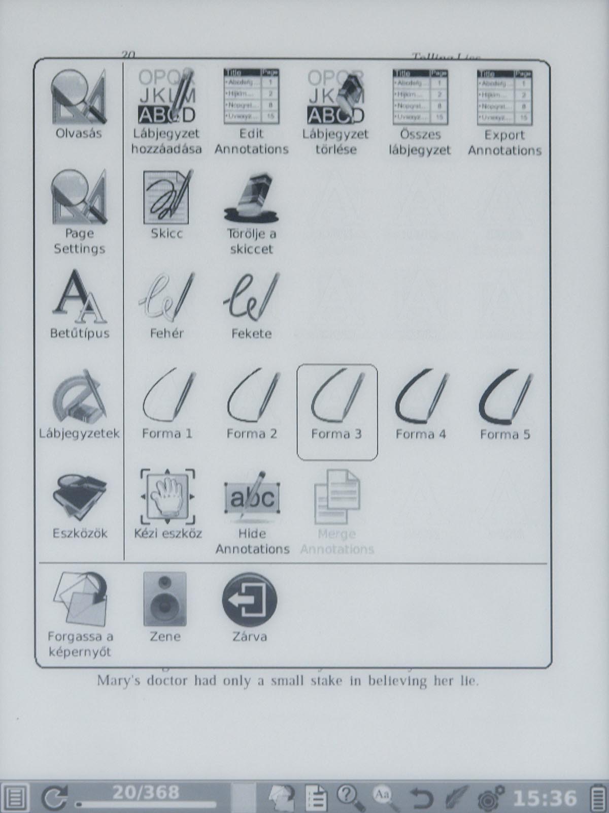 A könyvek olvasása közben létrehozhatunk könyvjelzőket, és a stylus segítségével arra is van mód, hogy adott részekhez jegyzeteket fűzzünk – ez a funkció azonban nem minden tartalomtípussal működik, a Mobi például e szempontból nem támogatott. Jó pont, hogy a stylus segítségével lapozni is lehet: ha a képernyő bal széléről húzzuk el a ceruzát a jobb oldalra, akkor előre lapozunk, ha fordítva, akkor pedig vissza. Ez azért jó, mert ha valaki jegyzetel, akkor lapozáshoz is használhatja a tollat, nem kell ilyenkor letenni, és a gombhoz nyúlni. A stylus pontosságán viszont még lenne mit javítani: a beviteli eszköz kalibráció után is nagyjából csak annyira pontos, mint amennyire a rezisztív PDA-k voltak.