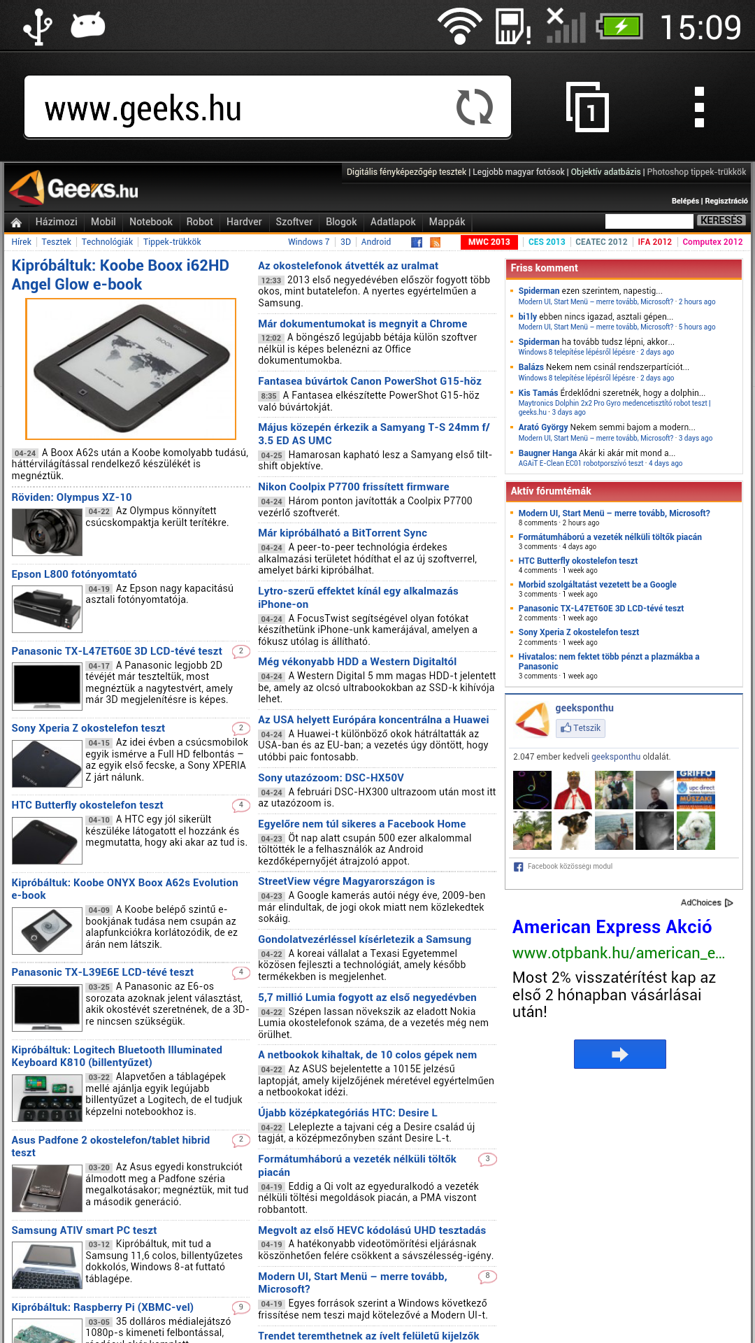 A HTC böngészéshez adja egyrészt a Chrome-ot, amely az Android 4.1 óta a hivatalos böngészője az Androidnak, de emellett megkapjuk a HTC „saját” szoftverét is. A Chrome előnye a szinkronizálás lehetősége, utóbbi viszont a Flash tartalmakat is kezeli, és képes a sorokat is újratördelni. Az 1920×1080 pixeles felbontás, talán mondanunk sem kell, minden oldal számára elegendő, a betűk rajzolata pedig gyönyörű – és a HTC telefonján nem volt gond a betűmérettel sem, a mobil mindig olvasható méretűre nagyította a fontokat.