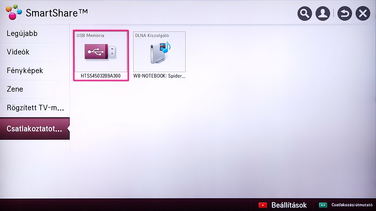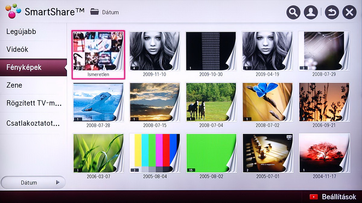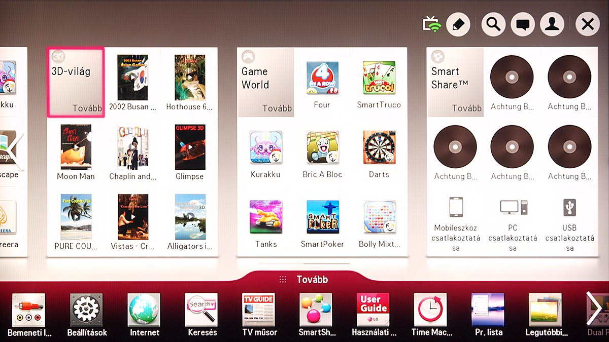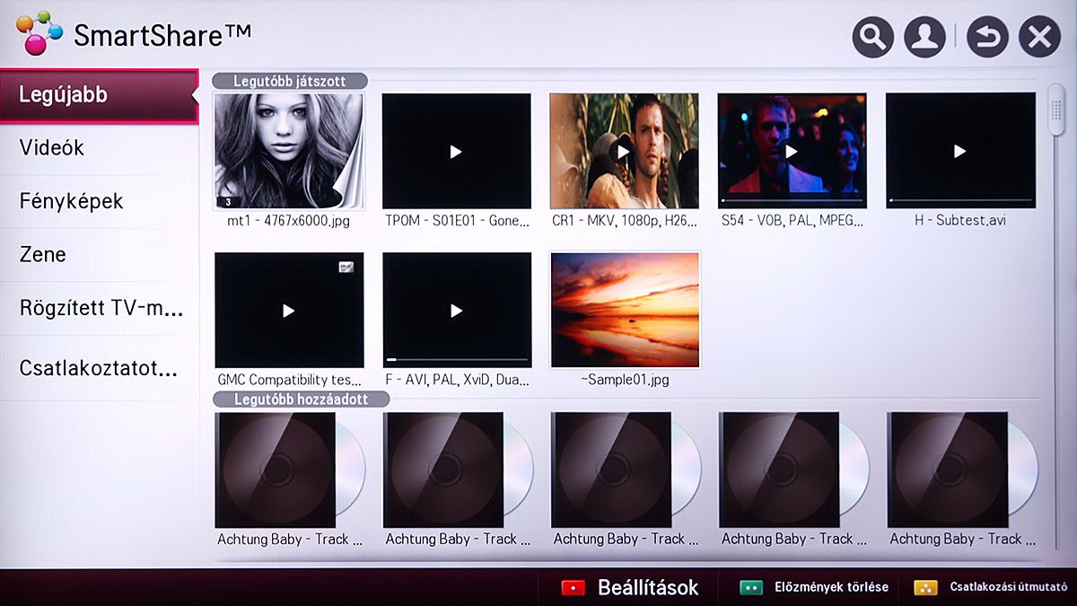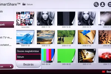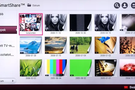 A médialejátszó a Home képernyőről indítható el, és SmartShare névre hallgat. Az LG a különféle források kezelését kiválóan oldotta meg, mert gyakorlatilag a forrástól független, hogyan használhatjuk a médialejátszót. A USB-re csatlakoztatott merevlemezek, a mobil eszközök és a hálózaton (DLNA kapcsolat segítségével) elérhető eszközök (PC, NAS, stb.), mind ugyanazt a felületet használják, sőt, az LG megoldotta azt is, hogy egyszerre több adathordozót is használhassunk. A felület ennek megfelelően változott, nem is kicsit.