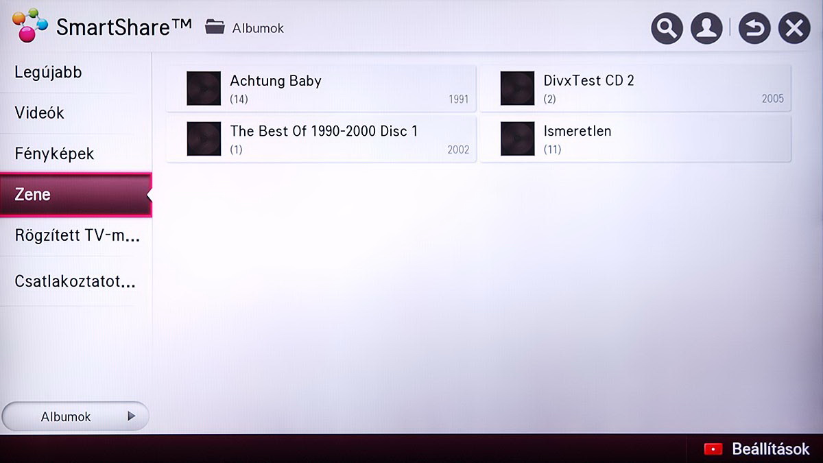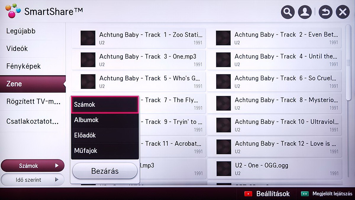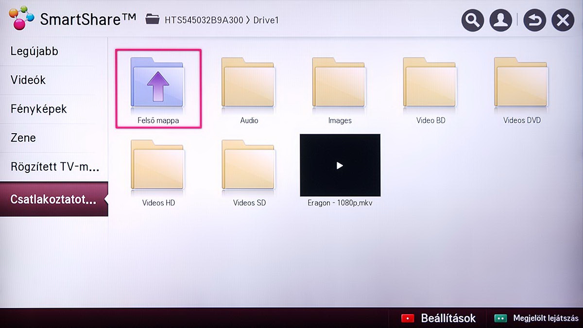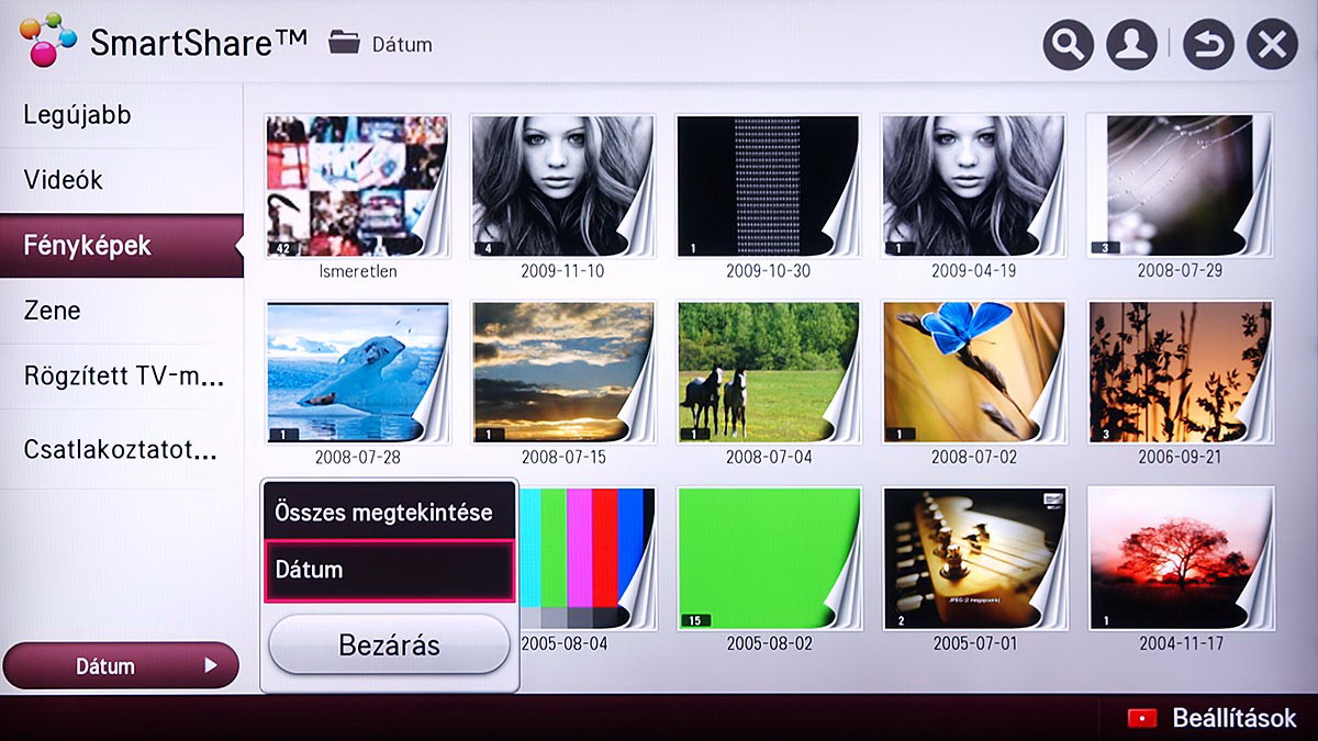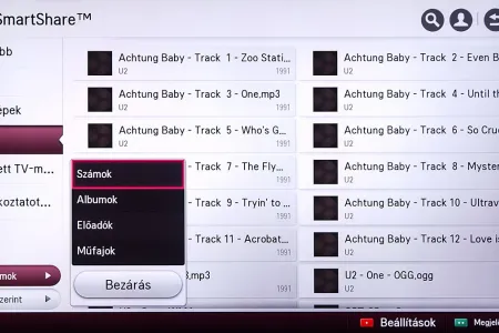 A médialejátszó a Home képernyőről indítható el, és SmartShare névre hallgat. Az LG a különféle források kezelését kiválóan oldotta meg, mert gyakorlatilag a forrástól független, hogyan használhatjuk a médialejátszót. A USB-re csatlakoztatott merevlemezek, a mobil eszközök és a hálózaton (DLNA kapcsolat segítségével) elérhető eszközök (PC, NAS, stb.), mind ugyanazt a felületet használják, sőt, az LG megoldotta azt is, hogy egyszerre több adathordozót is használhassunk. A felület ennek megfelelően változott, nem is kicsit.