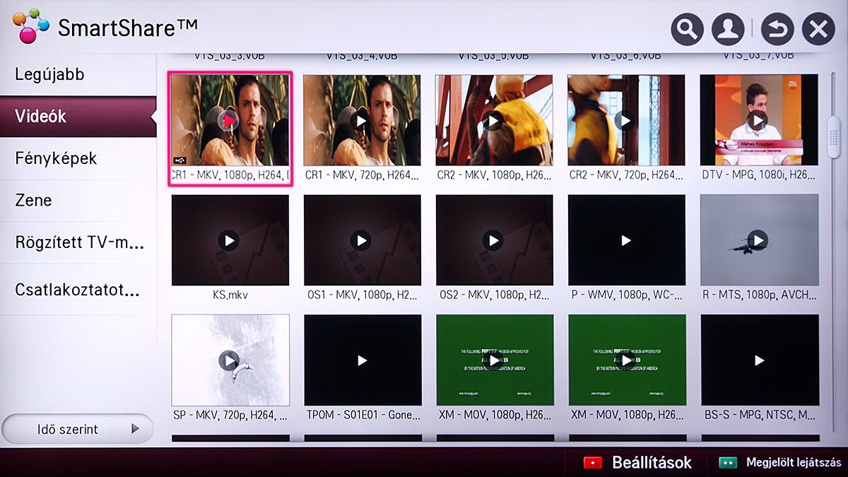 Amint a listából látszik, a videolejátszó sem a rippelt Blu-ray sem a rippelt DVD-ket nem kezeli – utóbbiakat viszont megnyithatjuk akkor, ha a közvetlenül a VOB-okat töltjük be. A feliratkezelés VOB-oknál nem működik, ezt leszámítva azonban mindenhol jól működik: nincs gond az ékezetes karakterekkel, és a tévének nem számít az sem, hogy a felirat fájlban vagy fájl mellett található meg.