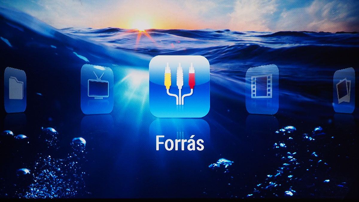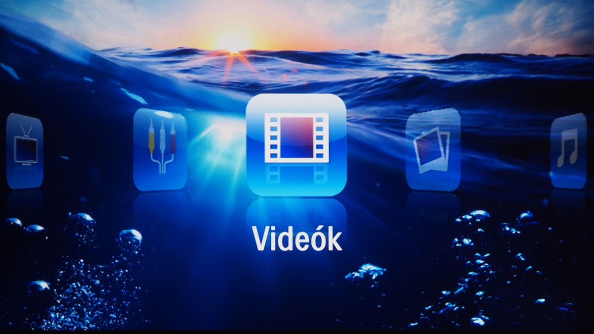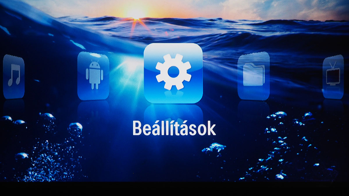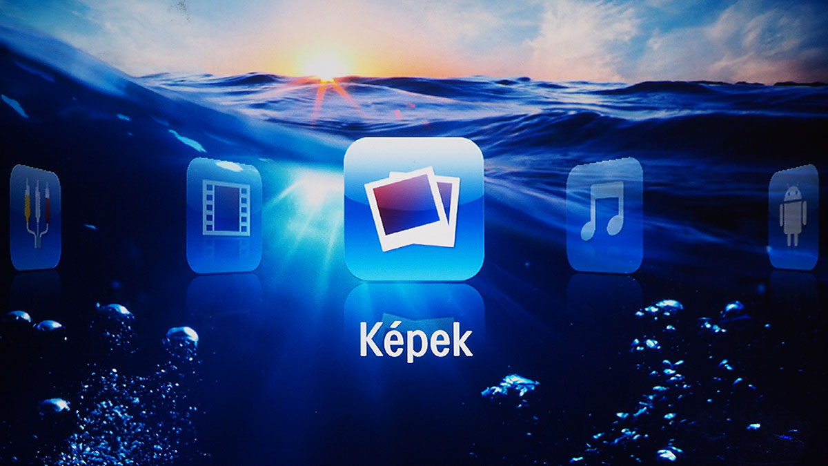 A főmenüből választhatjuk ki az aktuális videobemenetet, további négy opció pedig a képek, zenék és videók elérésére szolgál – azért van négy lehetőségünk, mert van egy mappanézet is (ez tulajdonképpen egy fájlkezelő), ami az összes tartalmat ömlesztve mutatja. A Digital TV menüpont segítségével a projektor az USB bemenetre csatlakoztatott tunert is kezelni tudja (feltéve, hogy az szabványos drájverrel működik), és természetesen látja azokat a fájlokat is, amelyek USB-re csatlakoztatott külső merevlemezen (vagy sticken) vannak. A menüstruktúra az Android illetve Beállítások menüponttal lesz teljes.