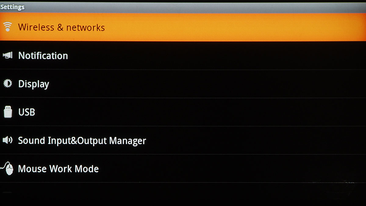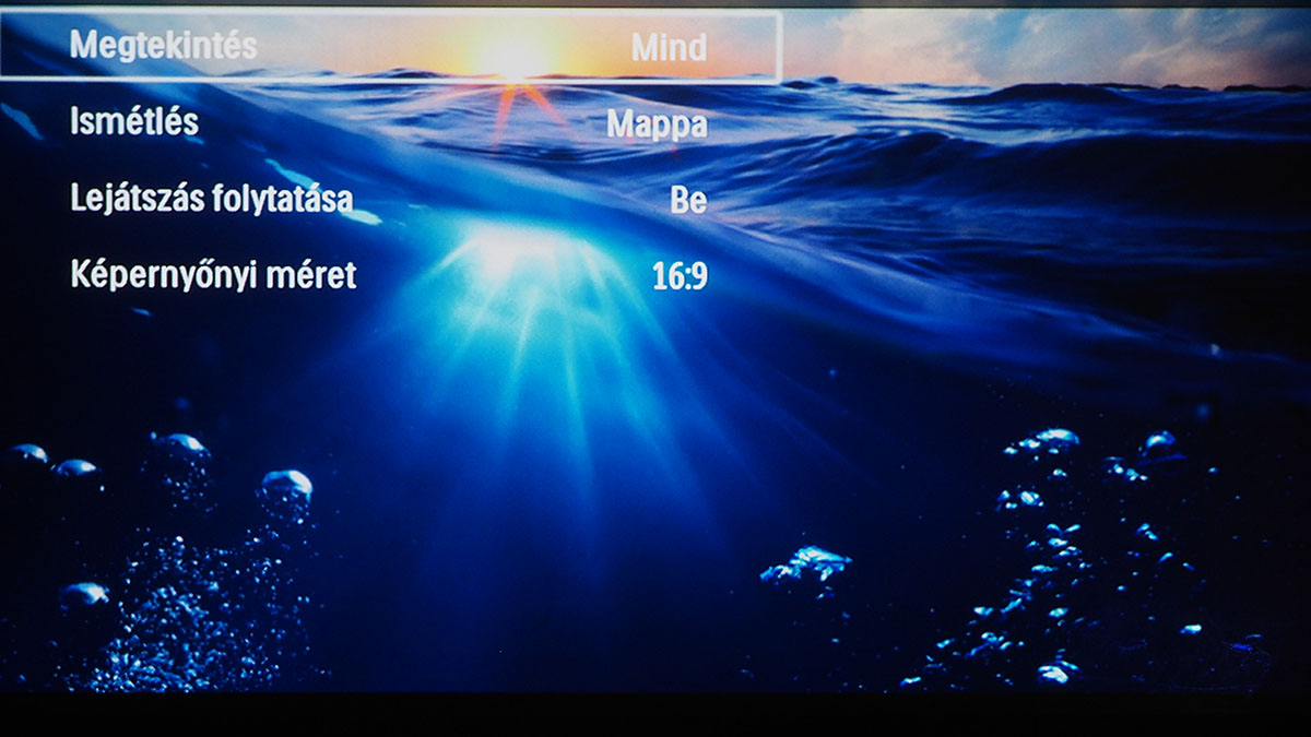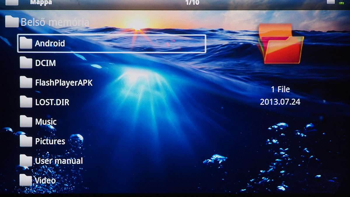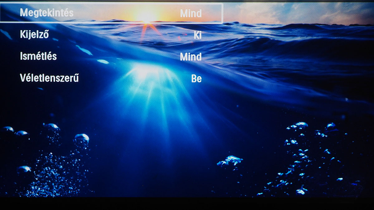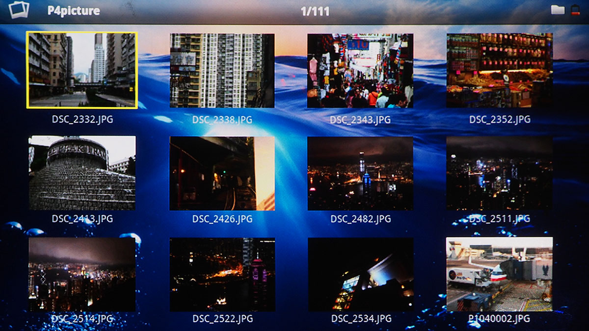 A főmenüből választhatjuk ki az aktuális videobemenetet, további négy opció pedig a képek, zenék és videók elérésére szolgál – azért van négy lehetőségünk, mert van egy mappanézet is (ez tulajdonképpen egy fájlkezelő), ami az összes tartalmat ömlesztve mutatja. A Digital TV menüpont segítségével a projektor az USB bemenetre csatlakoztatott tunert is kezelni tudja (feltéve, hogy az szabványos drájverrel működik), és természetesen látja azokat a fájlokat is, amelyek USB-re csatlakoztatott külső merevlemezen (vagy sticken) vannak. A menüstruktúra az Android illetve Beállítások menüponttal lesz teljes.