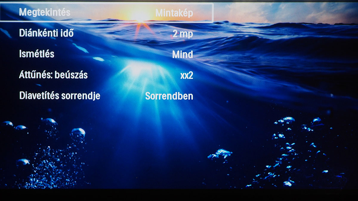 Beállítási lehetőségből nincsen túl sok, a kép esetében például gyakorlatilag csak a fényerő és a kontraszt állítható. Ez viszont nem feltétlenül gond, mert nyilván aki tökéletes képminőséget akar, az nem mikroprojektorral fog prezentációt tartani vagy filmet nézni – egy ilyen kütyü azoknak való, akiknek az elsődleges szempont a hordozhatóság. Van azért néhány színprofil is, de ezek látszólag nem csinálnak semmit azon kívül, hogy a fényerőt és a kontrasztot befolyásolják. A projektor képe viszont tükrözhető, ami jól jöhet hátulról történő vetítésnél valamint akkor, ha a PicoPix PPX3610 a mennyezetről lóg le. A multimédiás fájlok kezelésével kapcsolatos beállítások száma szintén nem sok; a filmek folytatása a legutóbbi ponttól, a diavetítés valamint a kétsávos hangszínszabályzó az, ami említésre méltó.