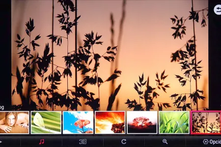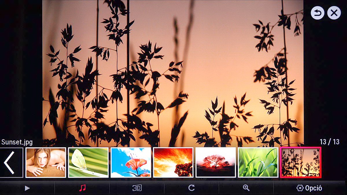 A képfájlok közül a tévé továbbra is csak a JPEG-eket látja, ami elvileg elég is, figyelembe véve, hogy az LG ezt a funkciót alapvetően a családi fotók nézegetésére szánja. A 47LA660S gond nélkül (és gyorsan) megbirkózik akár a 24 MP-es fotókkal is, és képes arra is, hogy a fotókból 3D-s változatot állítson elő (hogy milyen eredménnyel, az már más kérdés). A szokásos alapműveletek mind rendelkezésre állnak, így a fotókat forgathatjuk és nagyíthatjuk is, valamint kérhetünk diavetítést is, akár aláfestő zenével együtt.