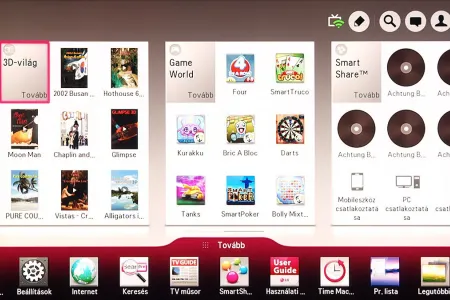 Az okostévé felület egy kisebb kozmetikázáson ment keresztül, az LG a 3D-s külsőt lecserélte a mostanában divatos „flat” megoldásra, így nincsenek árnyékok, nincsenek a felületből kiemelkedő ikonok, stb. A Smart felület logikailag továbbra is két egységre tagolódik: a kijelző nagyobb részét a tévé élőképe és a csoportokba rendezett alkalmazások foglalják el (kategóriánként a nyolc legtöbbet használt látszik), míg lent a saját alkalmazások láthatók. Az LG a tartalmakat Premium, Smart World, 3D World, Game World és Smart Share csoportokba szedte, ami gyakorlatilag egyezik a tavalyi elrendezéssel. A tévébe kétmagos processzor került, az igazat megvallva azonban ez a sebességen nem érződik túlságosan; nem lassú a 47LA660S, de villámgyorsnak sem mondanánk.