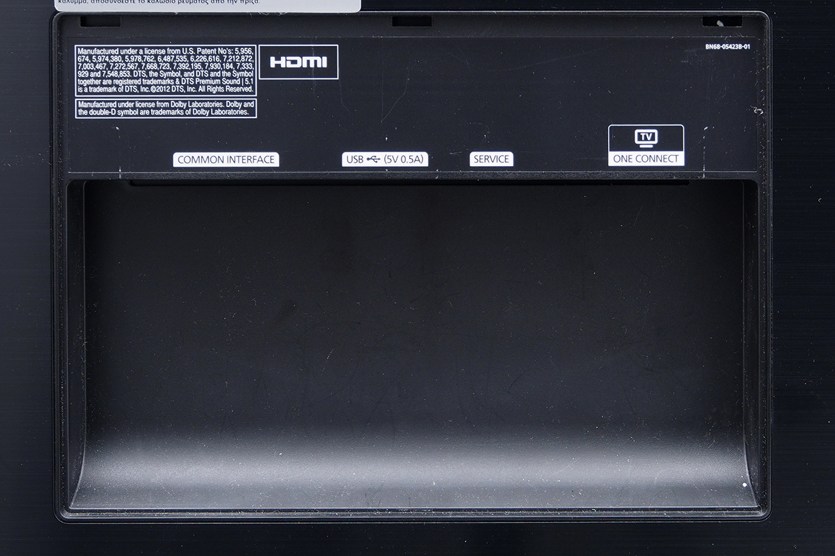 A hátlapon azonban nem ez az egyetlen furcsaság: a tévén ugyanis nem találjuk meg a hétköznapi csatlakozópanelt sem. Hátul mindössze a CI-adapter helye, egy USB port illetve egy One Connect feliratú aljzat sorakoznak. Természetesen ez nem azt jelenti, hogy a tévéről lemaradt volna a HDMI és a többi megszokott bemenet, ezeket azonban a Samsung egy külön dobozba helyezte el. Azon lehet vitatkozni, hogy ez a megoldás jó-e vagy sem – mi afelé hajlunk, hogy nem túl praktikus.