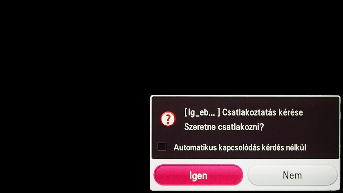 3. lépés: a telefon és a tévé elkezdenek kommunikálni egymással, azonban ahhoz, hogy a mobil képe megjelenjék a tévén, engedélyeznünk kell a kapcsolatot a megjelenítőn is. Az LG47LA740S esetében a jobb alsó sarokban ugrik fel a figyelmeztetés, hogy egy másik eszköz vezeték nélküli kapcsolatot szeretne létesíteni. Nyomjunk OK-t az engedélyezéshez; a Miracast adás elindul, a csatlakoztatott eszköz képe néhány másodpercen belül megjelenik a tévén.