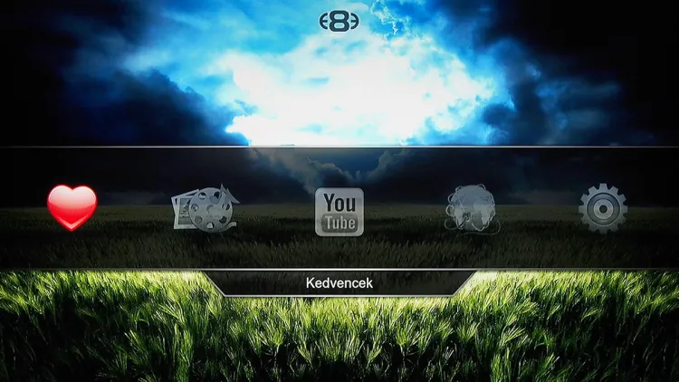 A főképernyőn összesen öt ikont látunk, amelyekkel sorrendben a kedvenceket, a saját fájlokat, YouTube videókat, különféle online tartalmakat illetve a beállításokat érhetjük el.