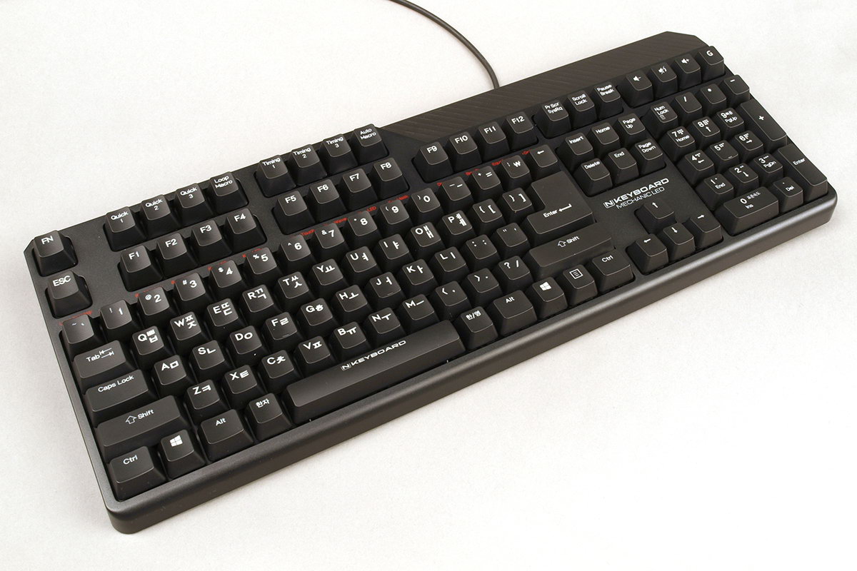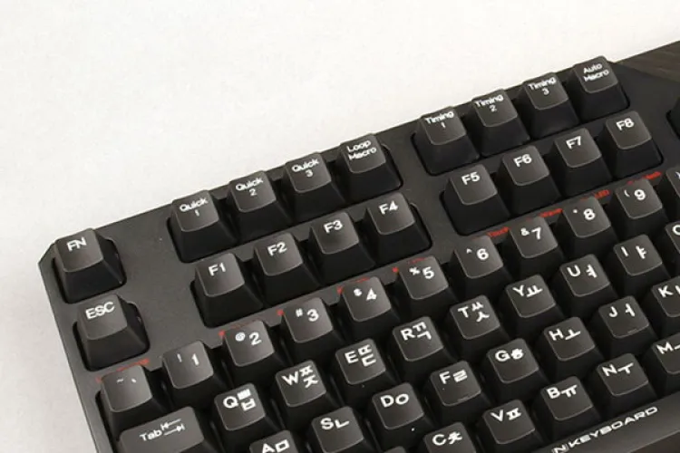 Ahogyan korábban már említettük, a klaviatúra összesen 106 normál gombot tartalmaz, amiben a számok és betűk valamint funkciógombok mellett megtalálható a teljes numerikus részleg és két extra, a koreai nyelv kiválasztása esetén használatos gomb is, merthogy a billentyűzet angol/koreai kiosztással készül. Hogy ez mennyire zavaró, azt mindenki döntse el saját maga. Ezen gombok mellett kapunk négy multimédiás gombot, amelyek közül három a hangerő szabályozására szolgál, a G feliratú pedig arra, hogy kikapcsoljuk vele a Windows gombot, így játék közben biztos, hogy nem fogunk véletlenül átlépni a Desktop felületre. A Num Lock kétszeri megnyomása a számológépet indítja el. A billentyűzetre ezeken felül felkerült az Fn gomb és további nyolc extra gomb is, amelyekkel a QTLA makró funkciók érhetők el – ezen gombok elfértek a billentyűzet bal oldalán, így jobbra van egy kis „felesleges” káva.