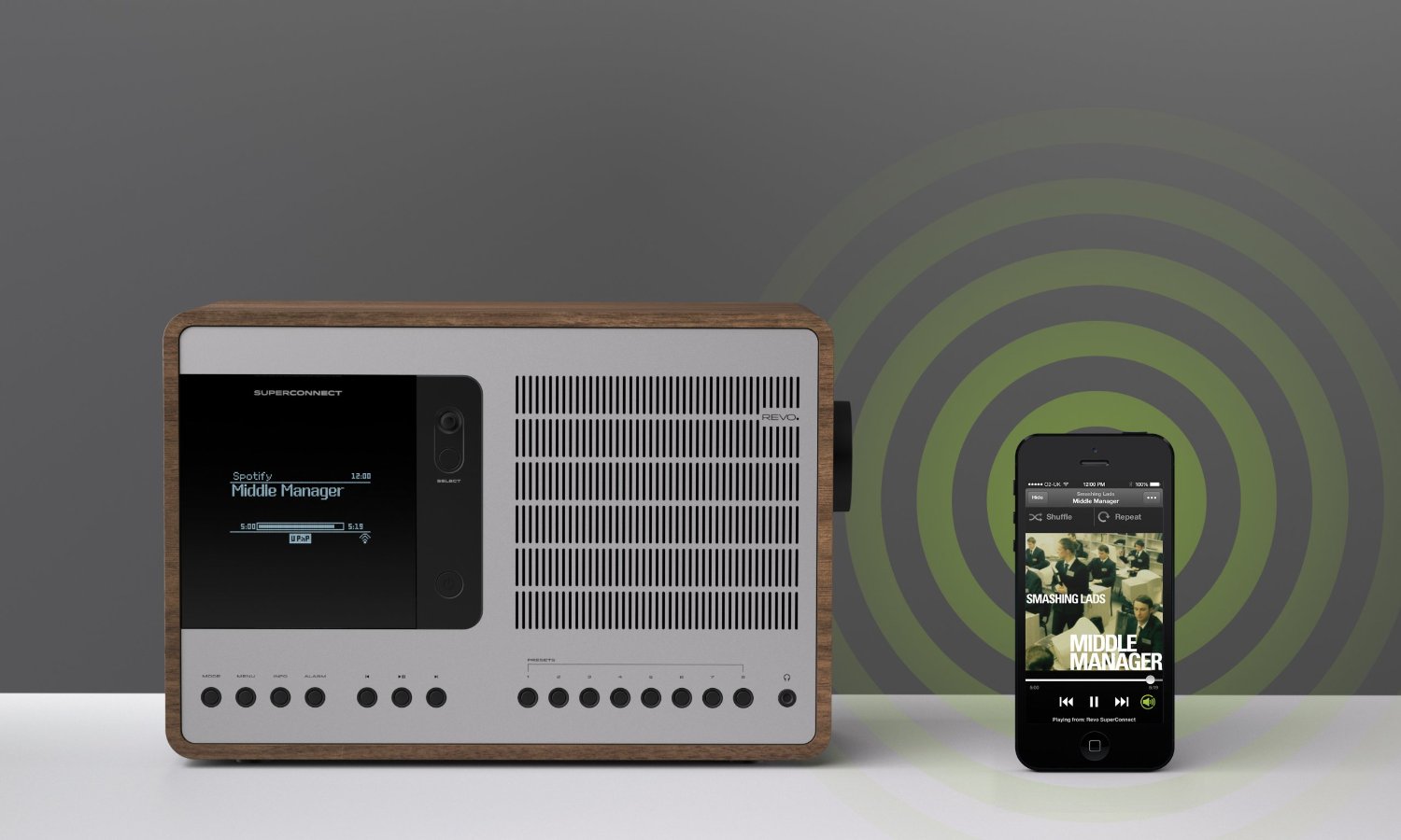 A Revo Superconnect támogatja a Spotify Connectet is, vagyis önállóan képes a Spotify zeneszolgáltatásához csatlakozni. A beállítás azonban túl bonyolult lenne a készüléken a kis kijelző és a távirányító miatt, ezért ezt a funkciót egy okostelefon vagy táblagép segítségével tudjuk elvégezni – a Spotify alkalmazást természetesen le kell töltenünk, és arra is szükség van, hogy rendelkezzünk élő Spotify felhasználói fiókkal. Az appal viszont nemcsak a Revo vezérlésére van mód, hanem arra is, hogy bekapcsoljuk vele magát a készüléket.