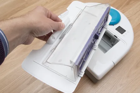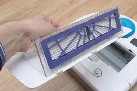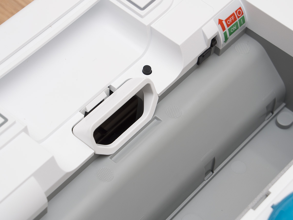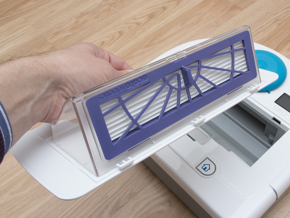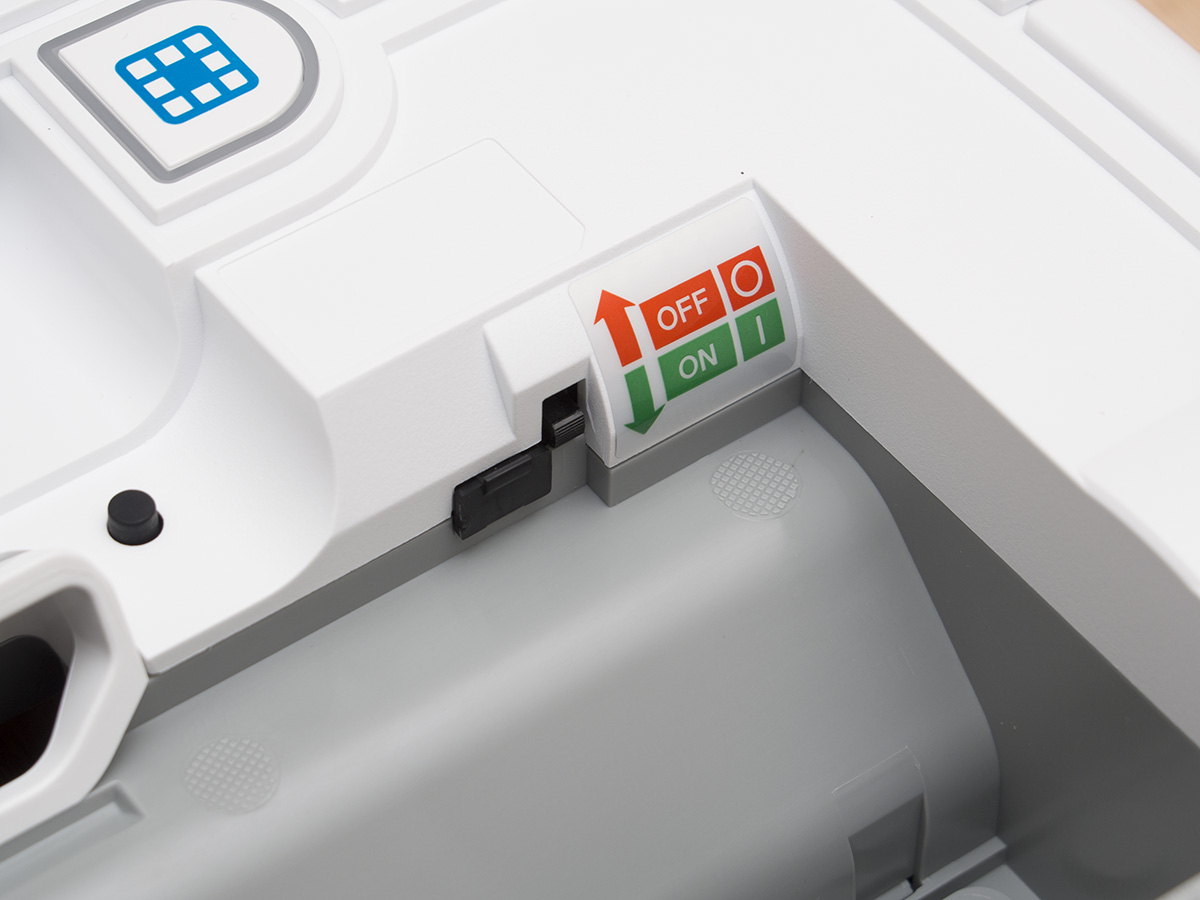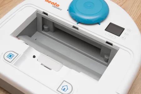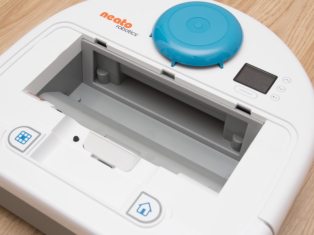 A tartályon belül található még egy ON/OFF kapcsoló, ami a robot főkapcsolója, és aminek a bekapcsolására a frissen kicsomagolt roboton külön matrica is figyelmeztet. A kapcsoló melletti kupak a robot frissítéséhez használható micro USB csatlakozót rejti. A Neato az egyetlen olyan porszívó (vagy talán egyetlen robot) gyártó, amely rendszeresen ad ki frissítéseket a robotjaihoz. A közel 5 éve bemutatott XV szériához még szeptemberben is készült frissítés, ami az akkumulátorkezelést hivatott javítani (jelenleg is teszteljük).